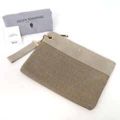 グレーの編み込み素材のクラッチバッグ、内側はドット柄デザイン。