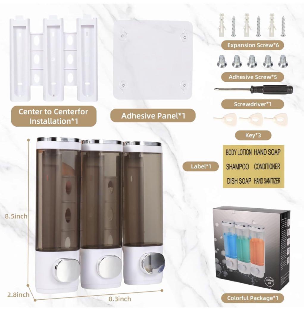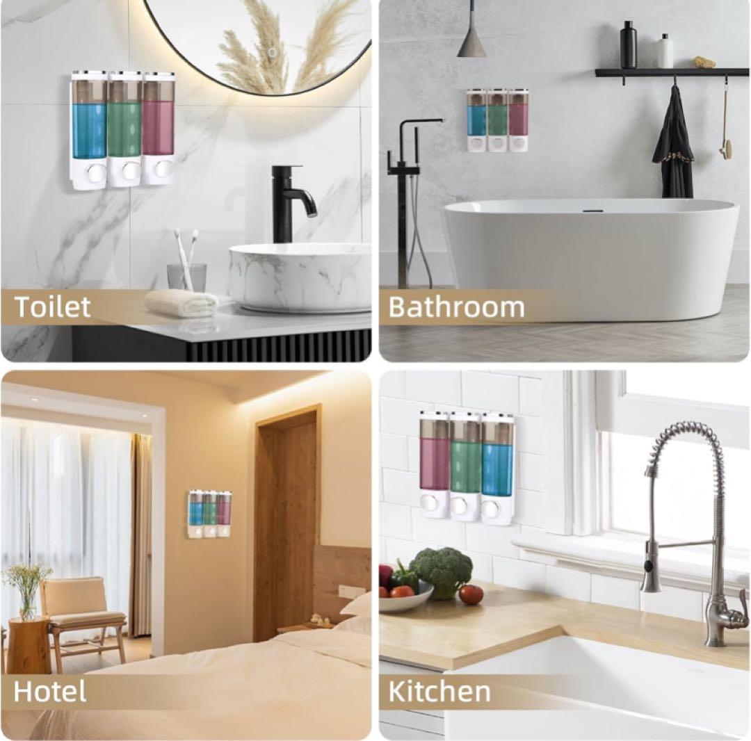 【大容量&汎用性】このソープディスペンサーは3×300mlの大容量で、この便利なディスペンサーでシャワーボトルの散らかりを解消します。壁から1つのチャンバーを持ち上げて、簡単に掃除や補充ができます。