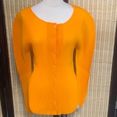 プリーツデザインの長袖カーディガン、ポリエステル100%。