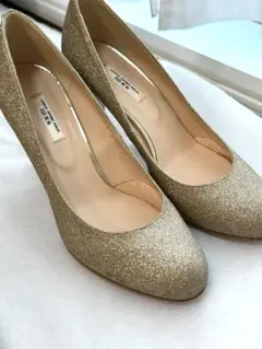 グリッター素材のゴールドポインテッドトゥハイヒール。