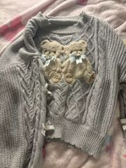 薄いグリーンの編み込みデザインでリボン付きのニットセーター。