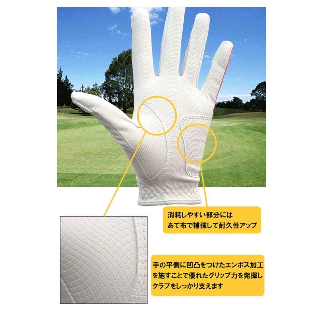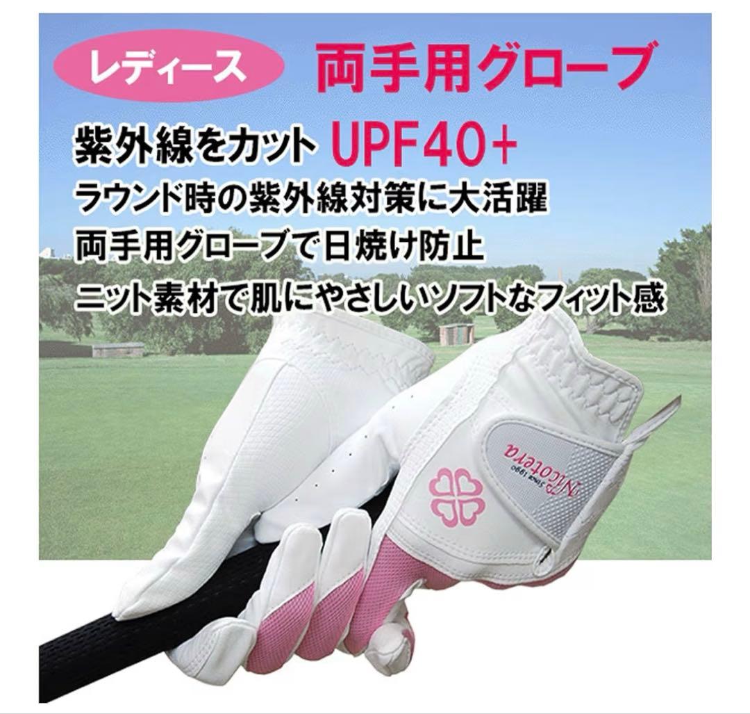 UPF40+で紫外線をカットし、ニット素材でソフトなフィット感のレディース両手用ゴルフグローブ。