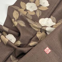 紺地に繊細な麻の葉模様が織り込まれた付け下げ柄付けの紬の着物です。大島紬と思いますが、証紙がありませんので、写真でご確認いただきたいと思います。八掛の色は黒でカッコいいデザインです。コーディネート次第で年齢幅広くお召しになれると思います。