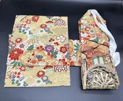観世水や扇、草花文様の入った縁起の良い吉祥文様の正絹 唐織の名古屋帯になります。