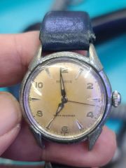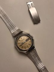 シルバーの自動巻き時計、日付表示付き、Bulova製ストラップ。