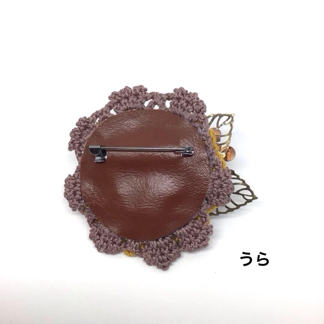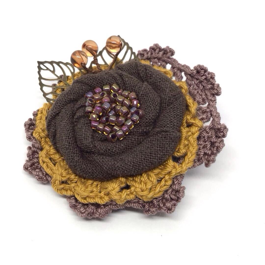 かぎ針編みのモチーフと布を組み合わせて作ったハンドメイドのお花のブローチです。