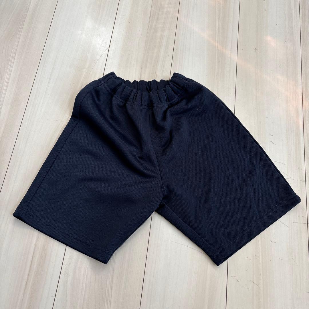 ネイビーのポリエステル製体操服、ウエストゴムとポケット付きで快適な着用感。