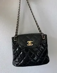 ダークグリーンのキルティングレザー製フラップバッグ、ゴールドチェーン付き。