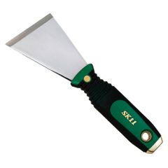 金属製の平刃スクレーパー、グリーンのハンドル付きで塗装剥がしに最適。