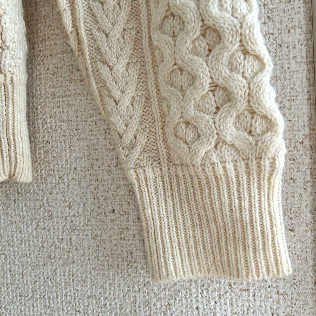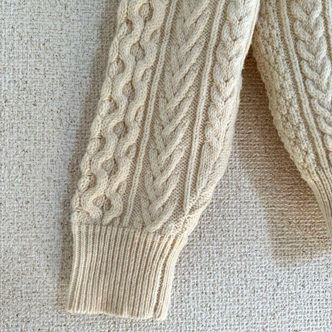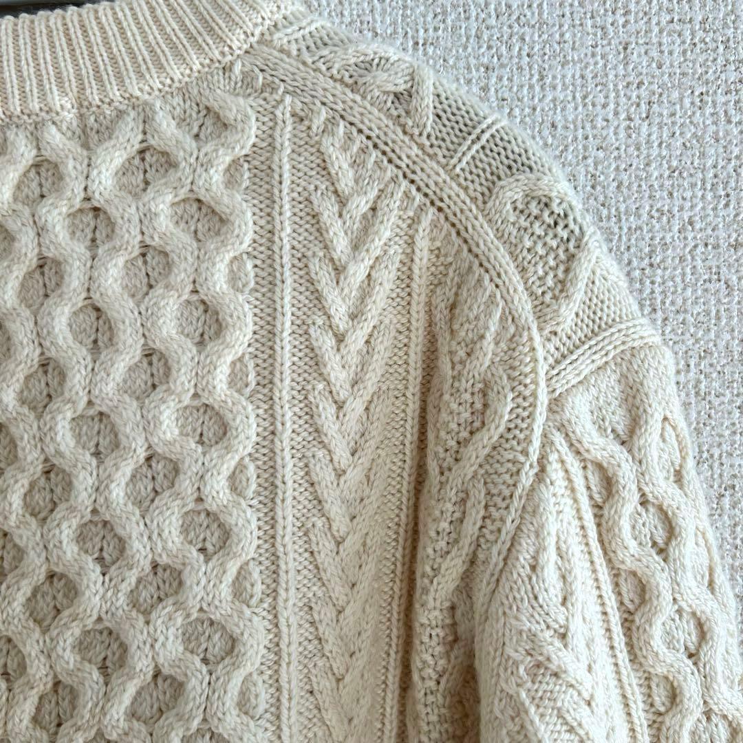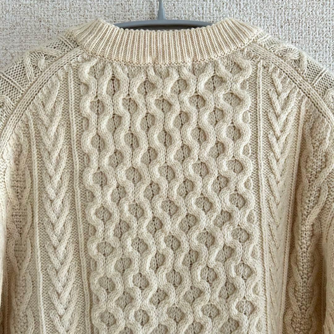 メンズのケーブル編みニットですが、男女問わず着用できるデザインだと思います。