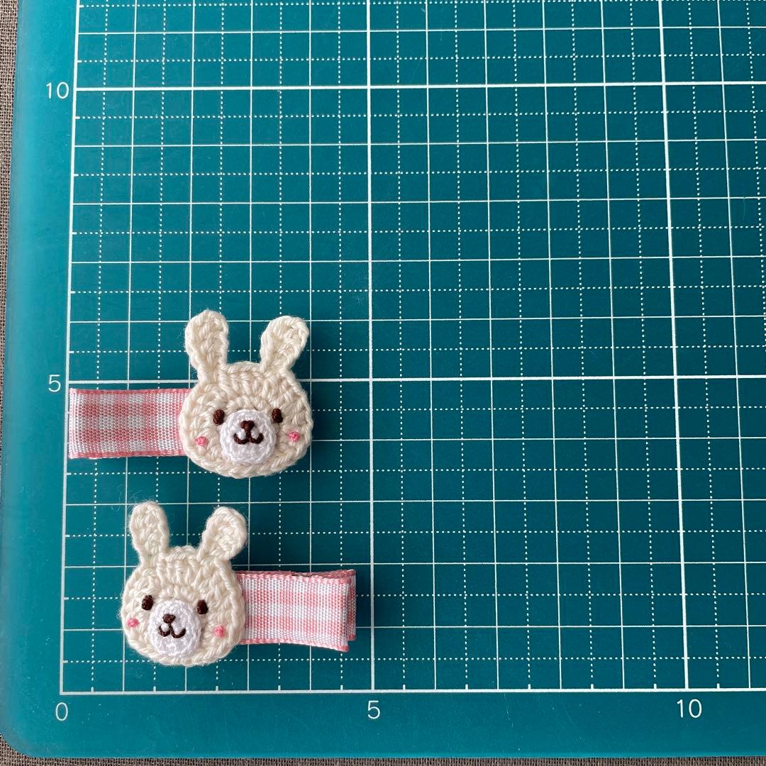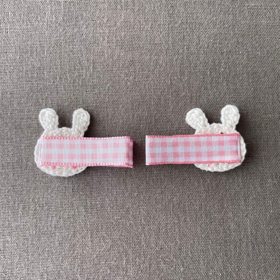 長さ約3.5cmのやっとこピンにギンガムチェック柄リボンを巻き付け、作家さんが編んでくださった可愛いうさぎさんを付けました♡
