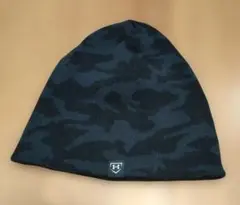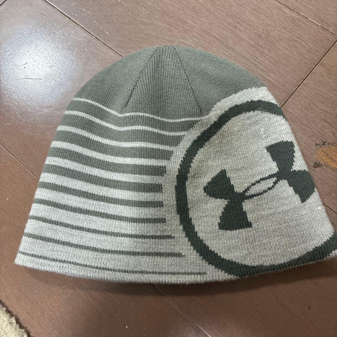 グレーのストライプデザインとUnder Armourのロゴが特徴のニット帽。