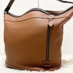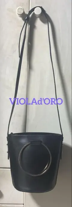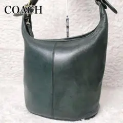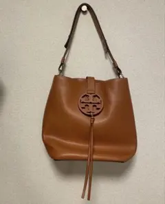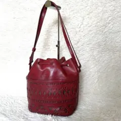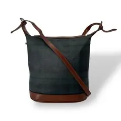 バケツ型の青いPVC素材のショルダーバッグ、赤と緑のアクセント付き。