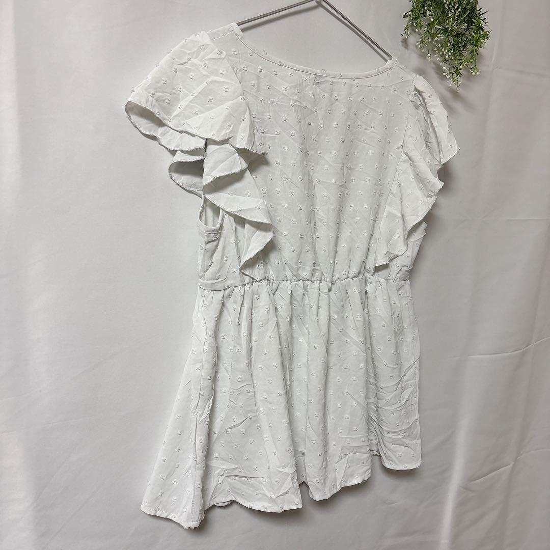 フリル袖とボタン付きのホワイトノースリーブシャツ。