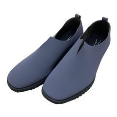 シンプルなブラックのスクエアトゥスリッポン、低ヒールで快適な履き心地。