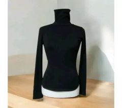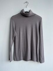 ダークグレーのタートルネック長袖Tシャツ、ポリエステルと綿の混合素材で快適な着心地。