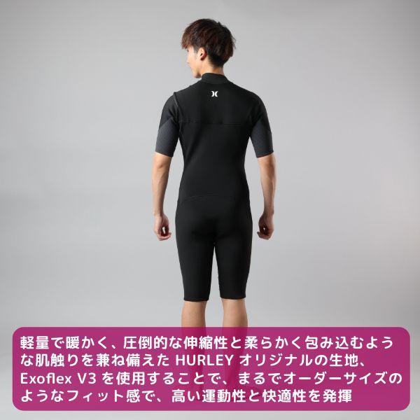軽量で暖かく、 圧倒的な伸縮性と柔らかく包み込むような肌触りを兼ね備えたHURLEYオリジナルの生地、Exoflex V3を使用することで、まるでオーダーサイズのようなフィット感で、高い運動性と快適性を発揮。