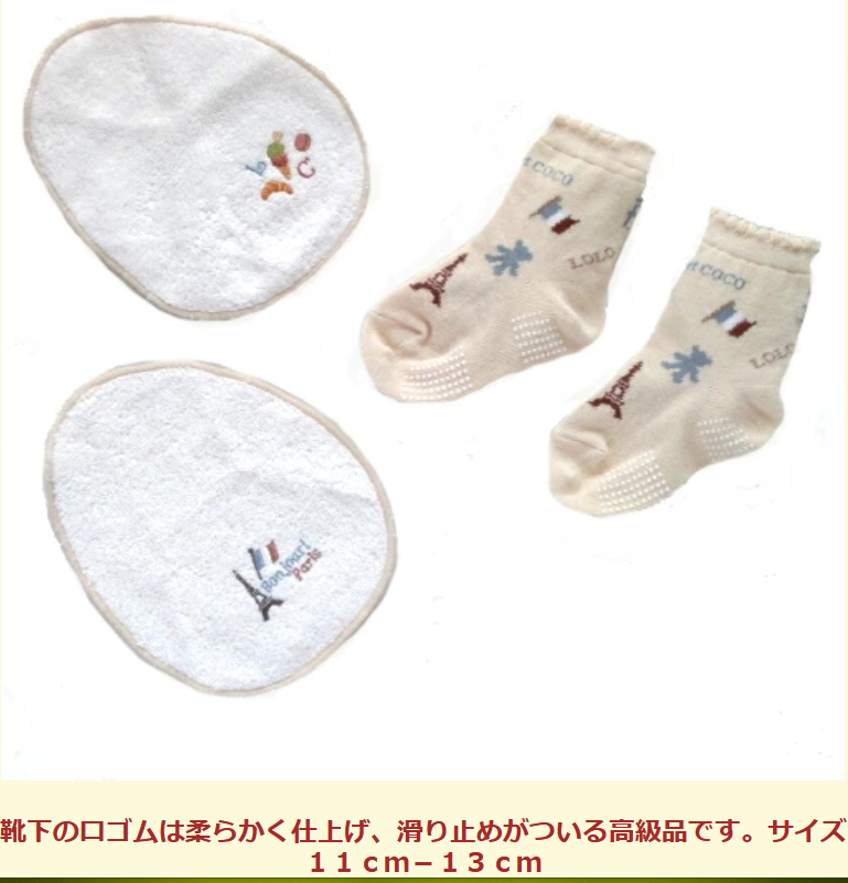 ソックスは口ゴムが柔らかく、滑り止めもついた高級品です。サイズ11cm-13cm。
