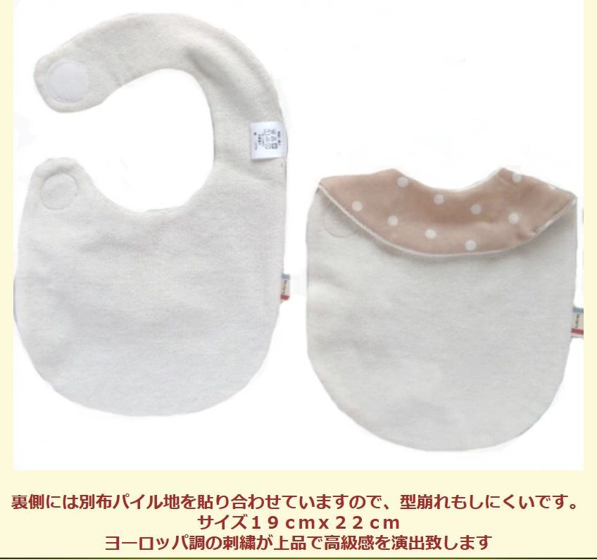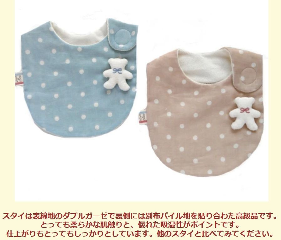 スタイは表オーガニックコットン製2重ガーゼ、裏パイル仕上げです。やわらかくて吸湿性にとんだ高級スタイです