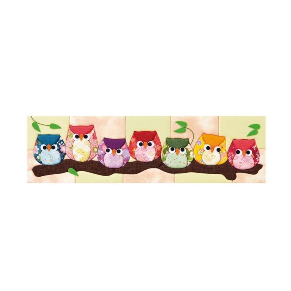 ・個性あふれるふくろうたちを色柄の華やかなちりめん布で表現し、賑やかな雰囲気に仕上げる