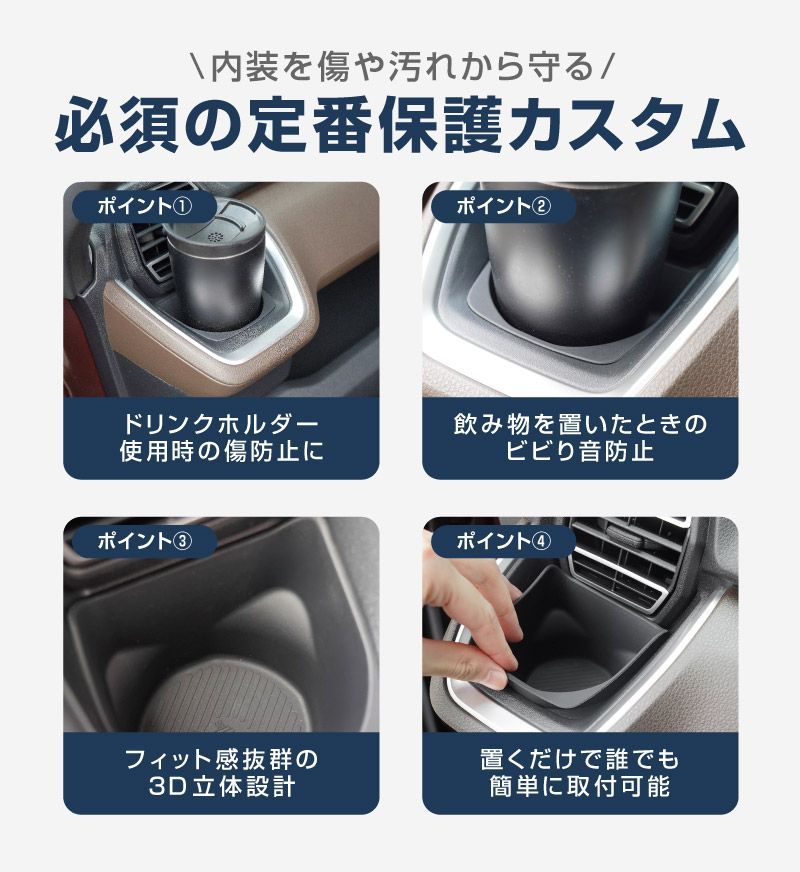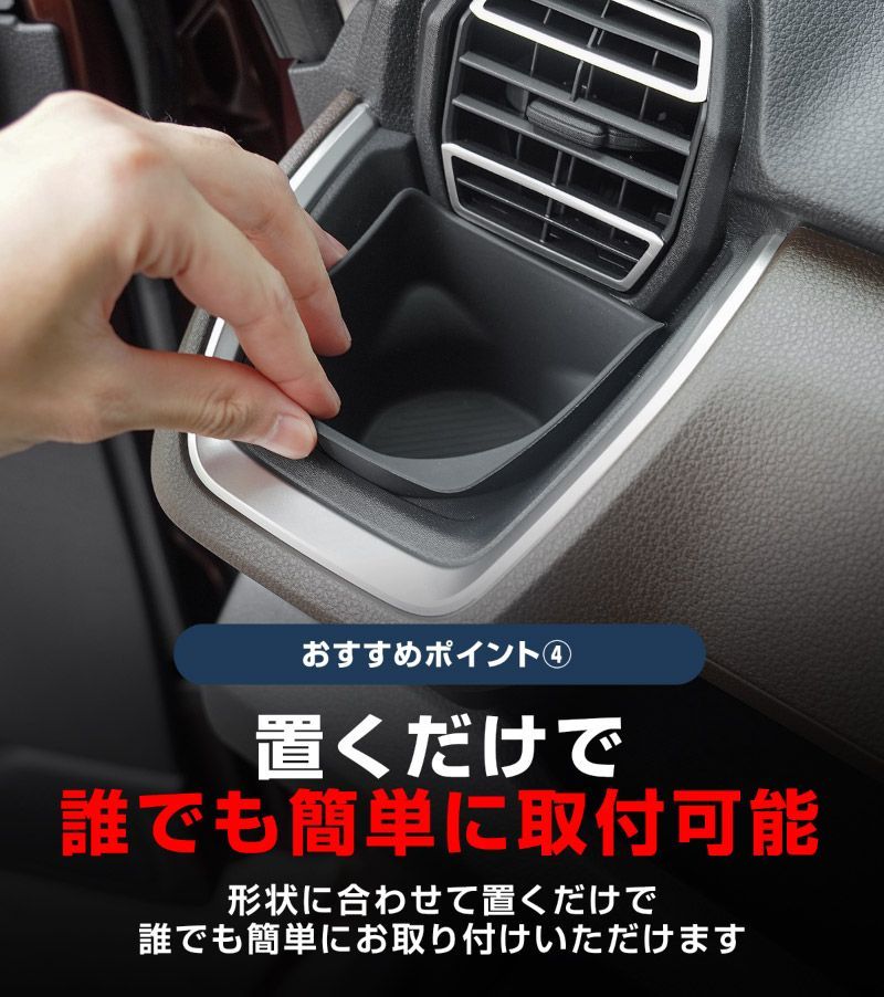 車種専用設計でジャストフィット!純正形状を再現しているので、置くだけ・はめ込むだけで簡単に装着でき、取り外しもラクラク。