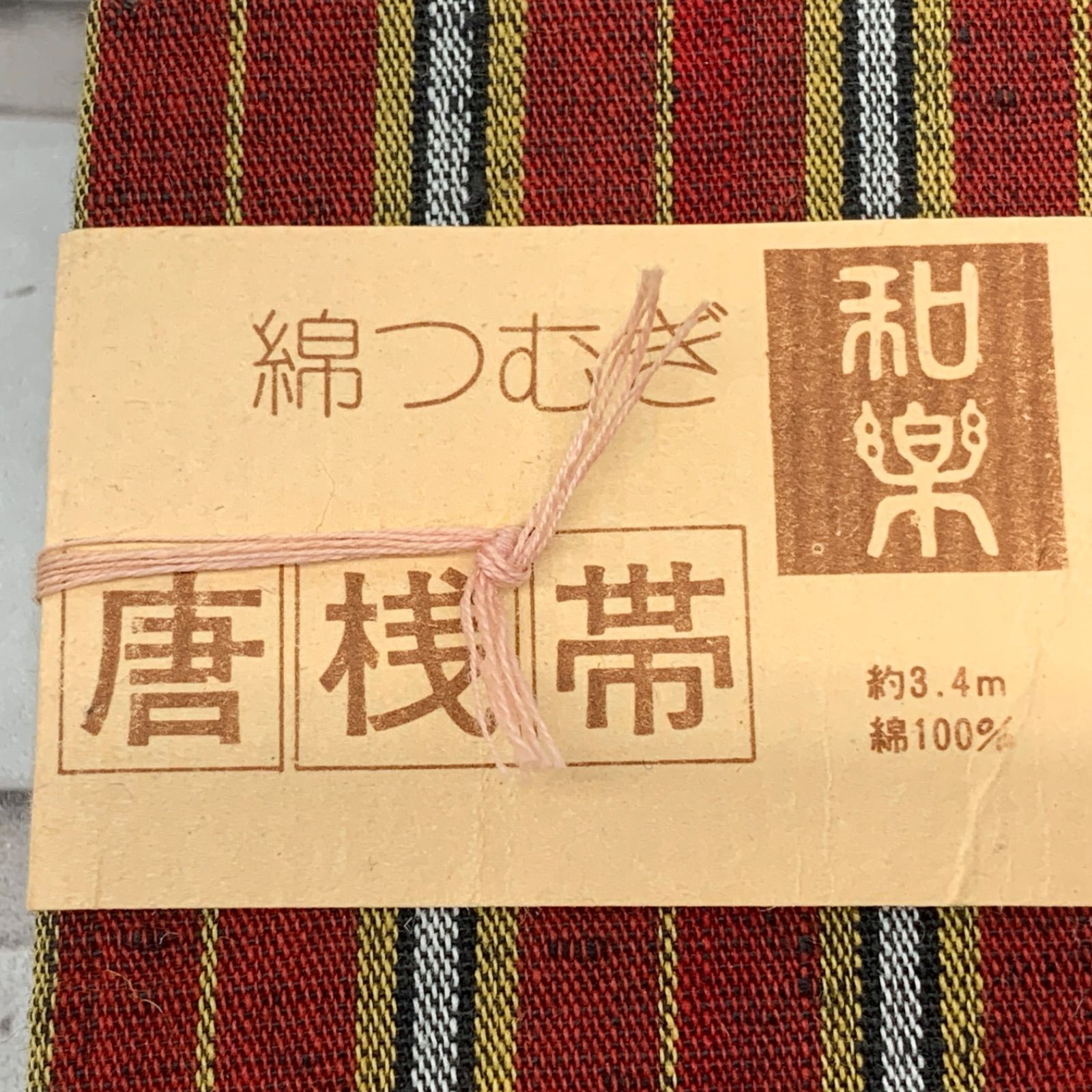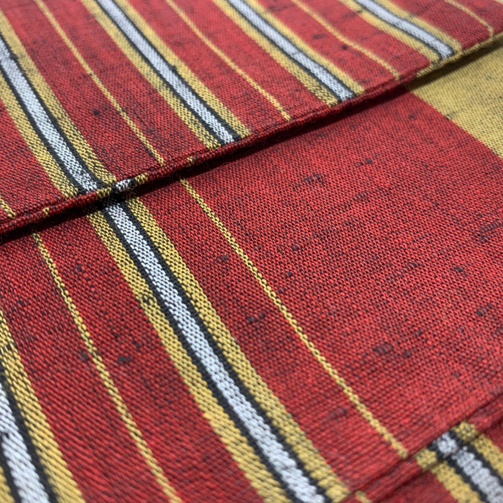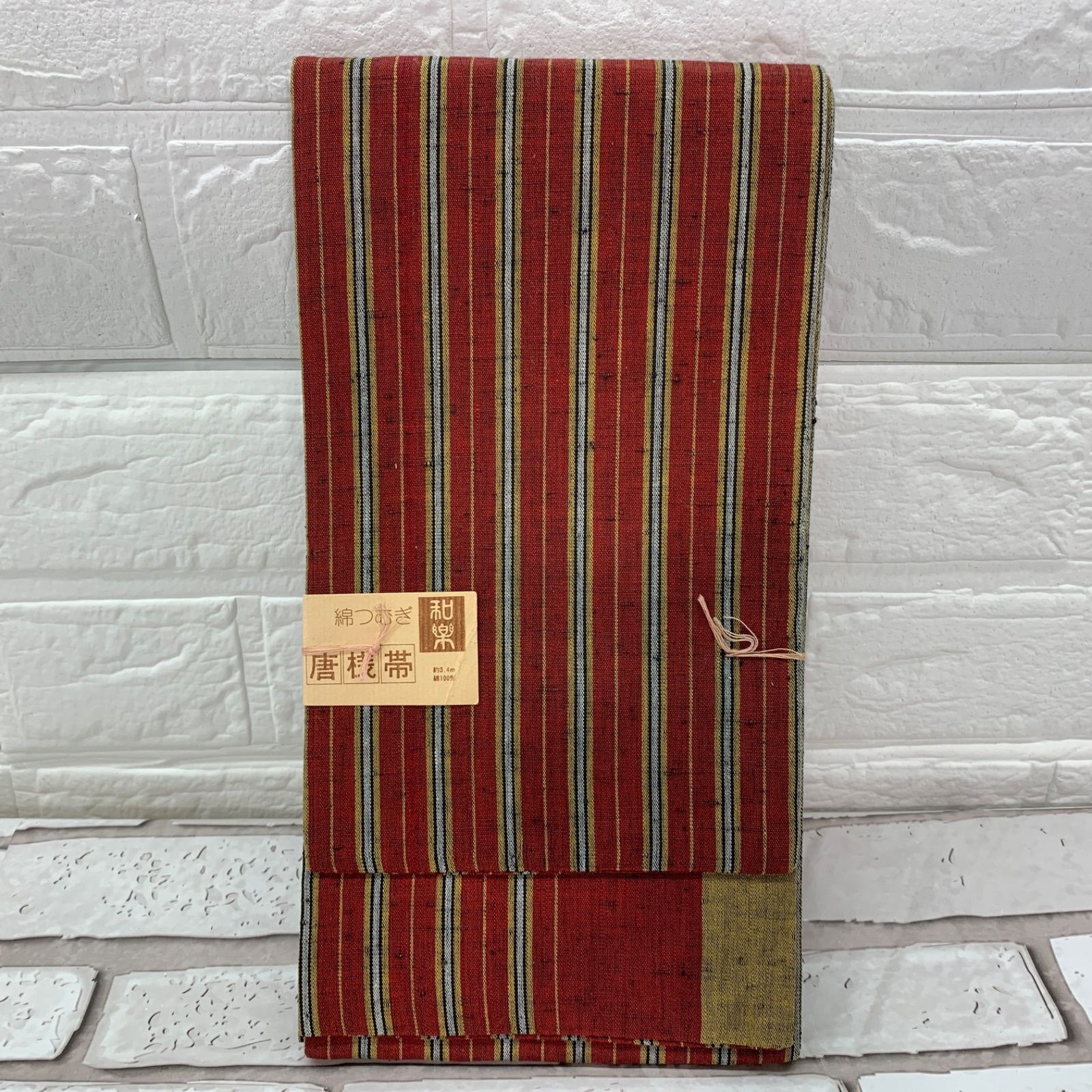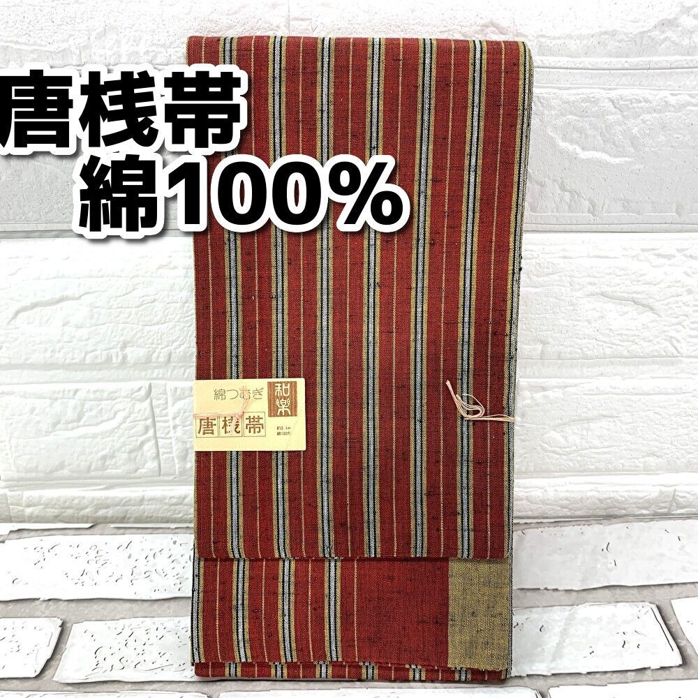 半巾帯 半幅帯 綿つむぎ 和楽 唐桟帯 綿100% 朱色系 ボーダー柄