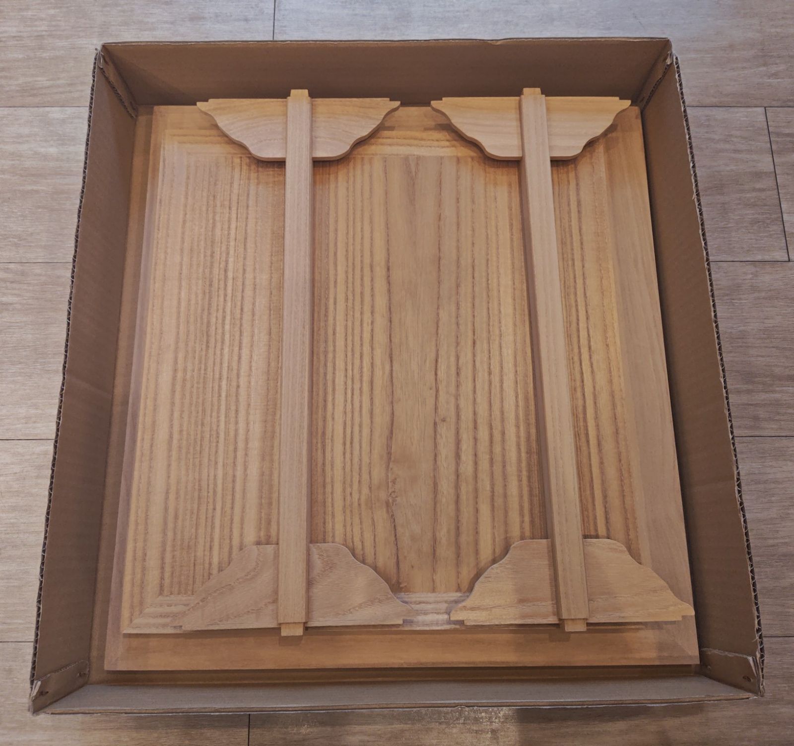大きさは、天板の横幅が45.5cm、縦幅が42.5cmです。下板の横幅が39.5cm、縦幅が37cm、高さが43.5cmで付属品は紙箱です。