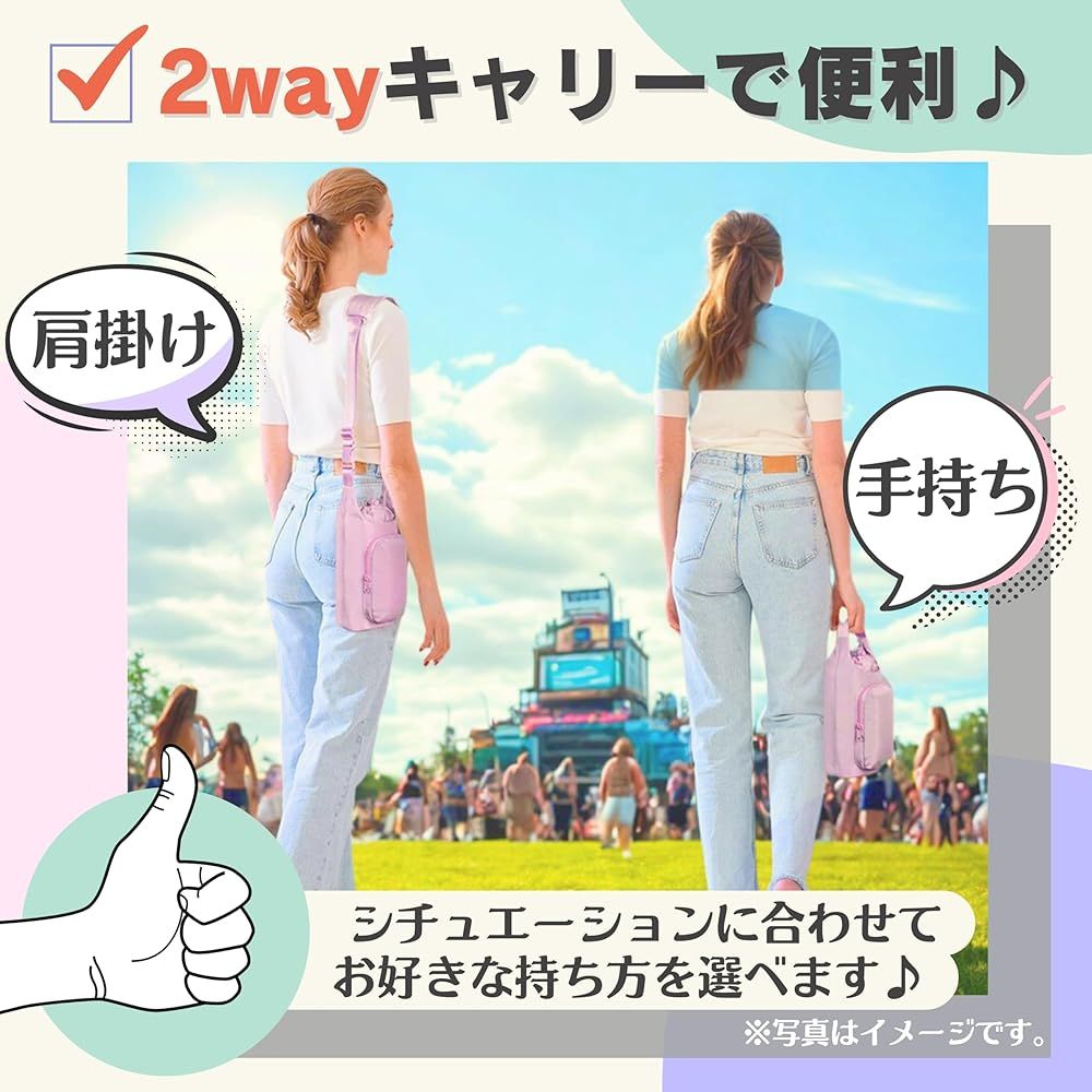 【2way持ち運び】付属のストラップで肩に掛けるだけでなく、バックルで鞄やベルトループに引っ掛けたり手持ちスタイルでも使える2way仕様!