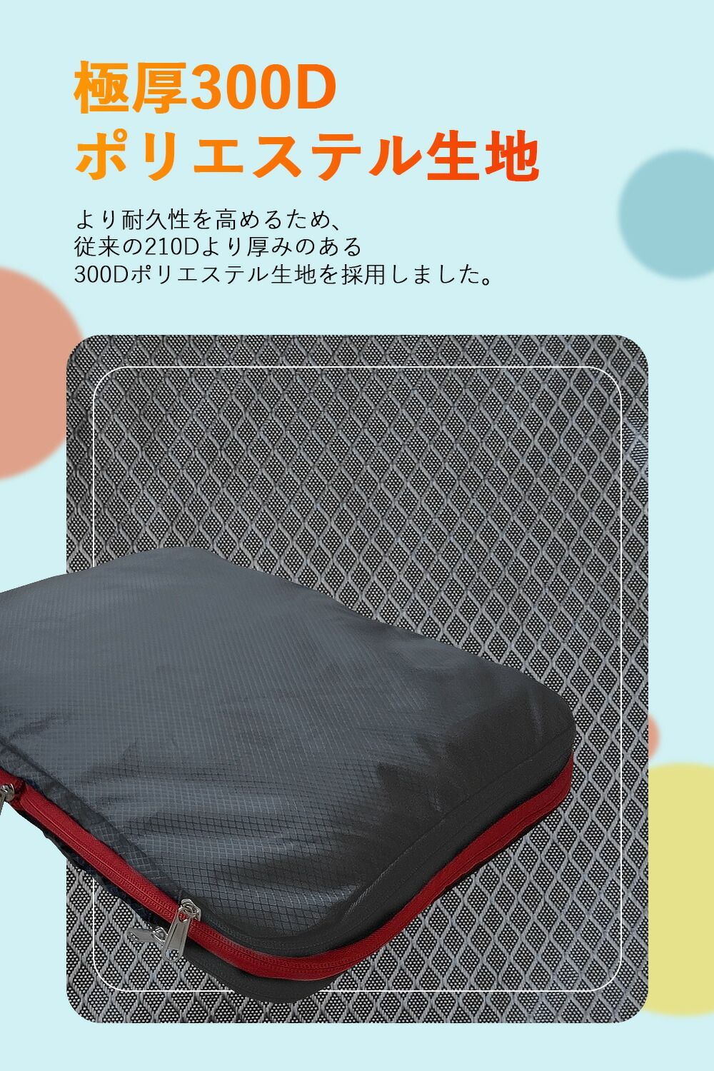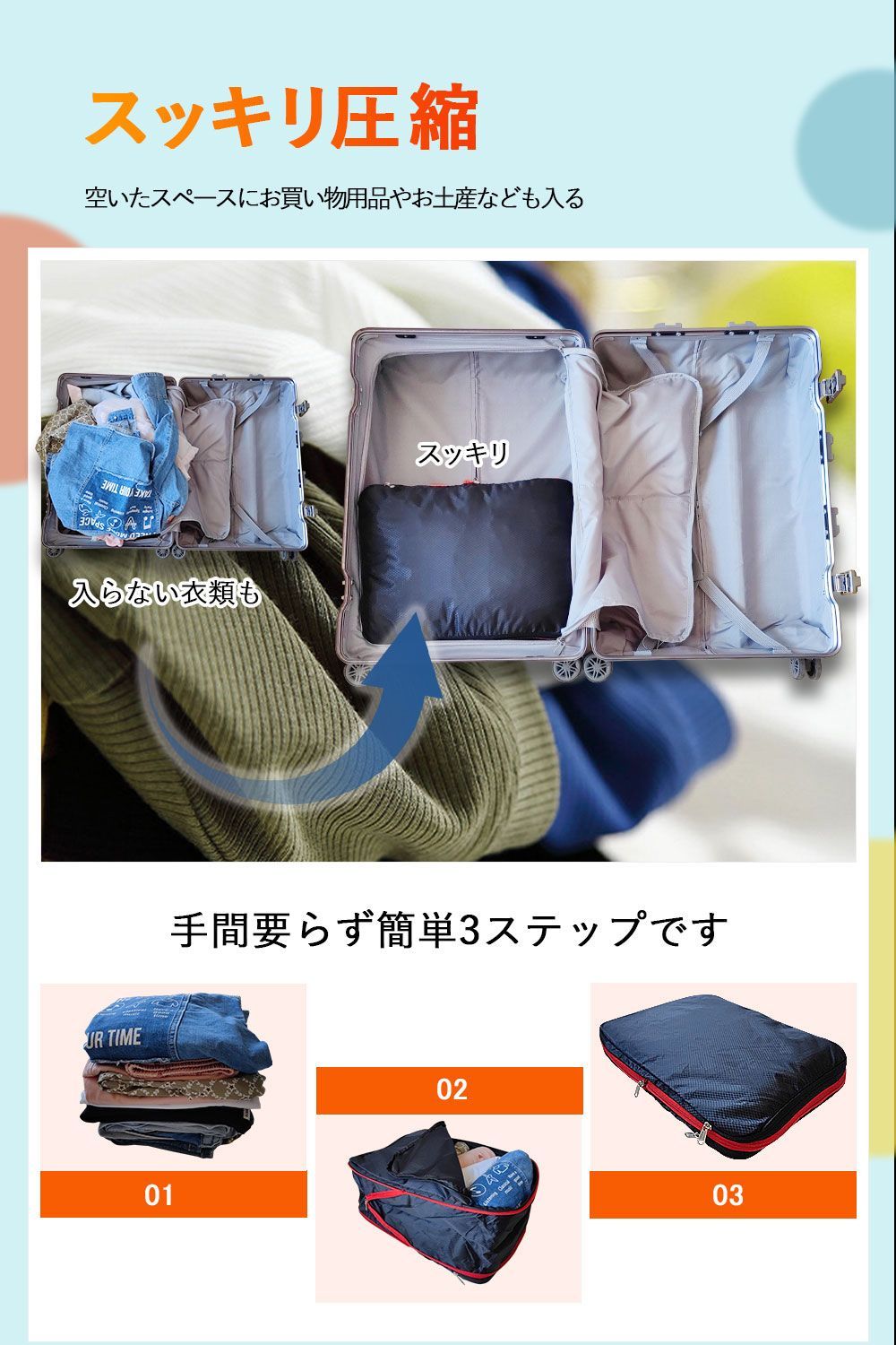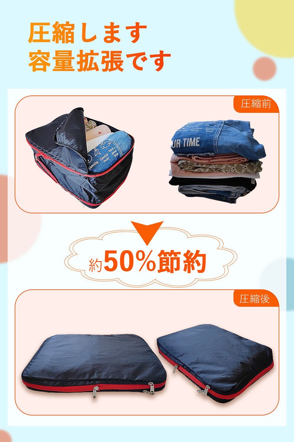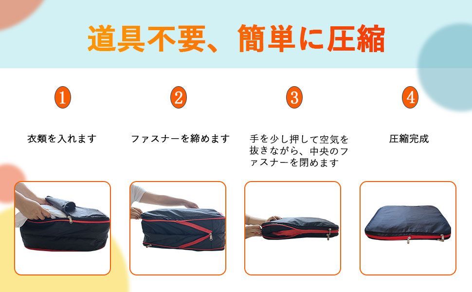 圧縮バッグに衣類を入れた後、圧縮ジッパーを閉めることでスーツケース内の衣類スペースを約50%節約できます、収納が苦手な人に役立つ圧縮バッグです。