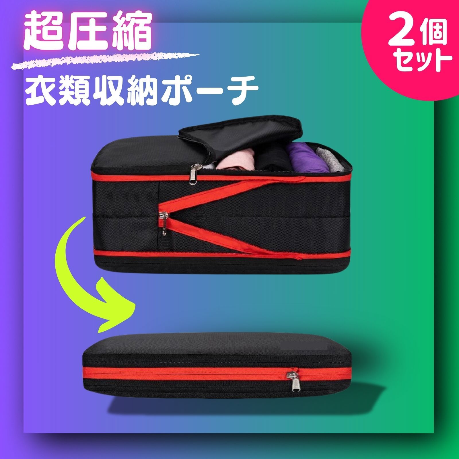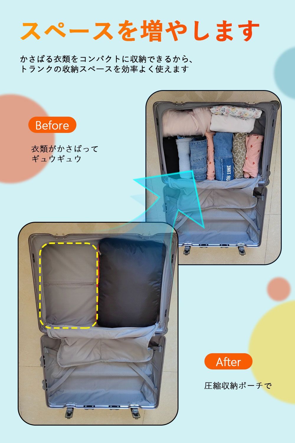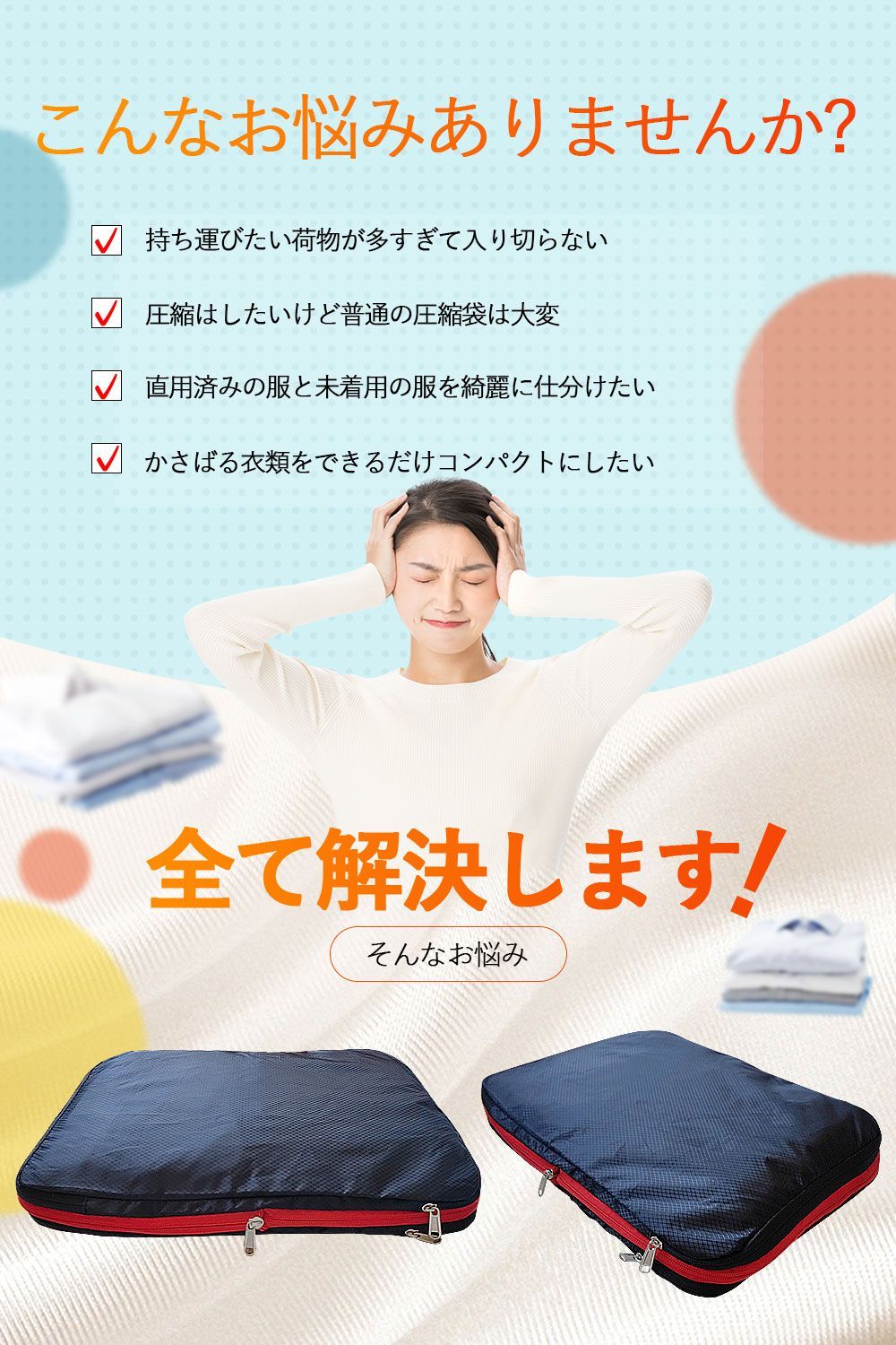 圧縮バッグに衣類を入れた後、圧縮ジッパーを閉めることでスーツケース内の衣類スペースを約50%節約できます、収納が苦手な人に役立つ圧縮バッグです。