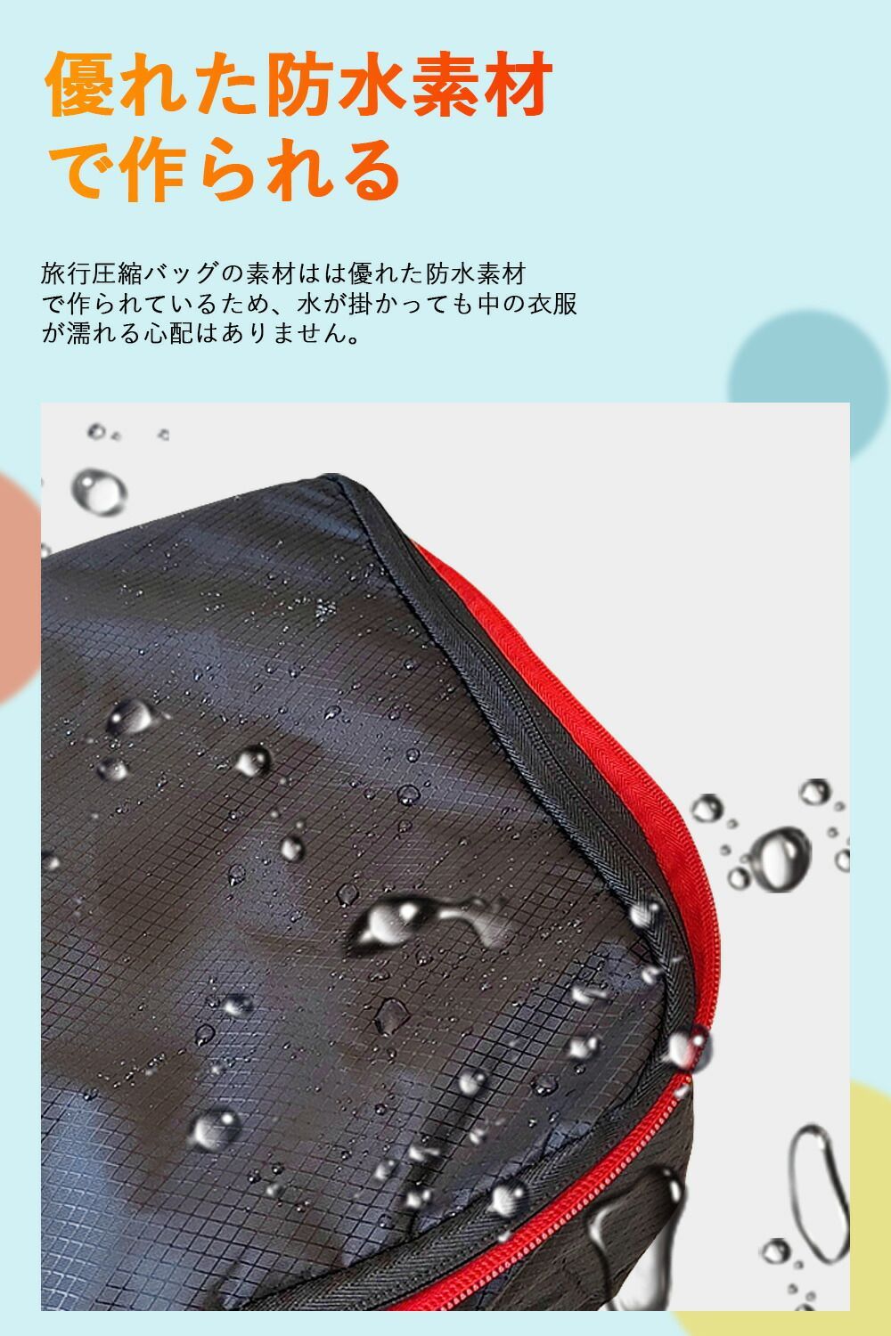 旅行圧縮バッグの素材はは優れた防水素材で作られているため、水が掛かっても中の衣服が濡れる心配はありません。