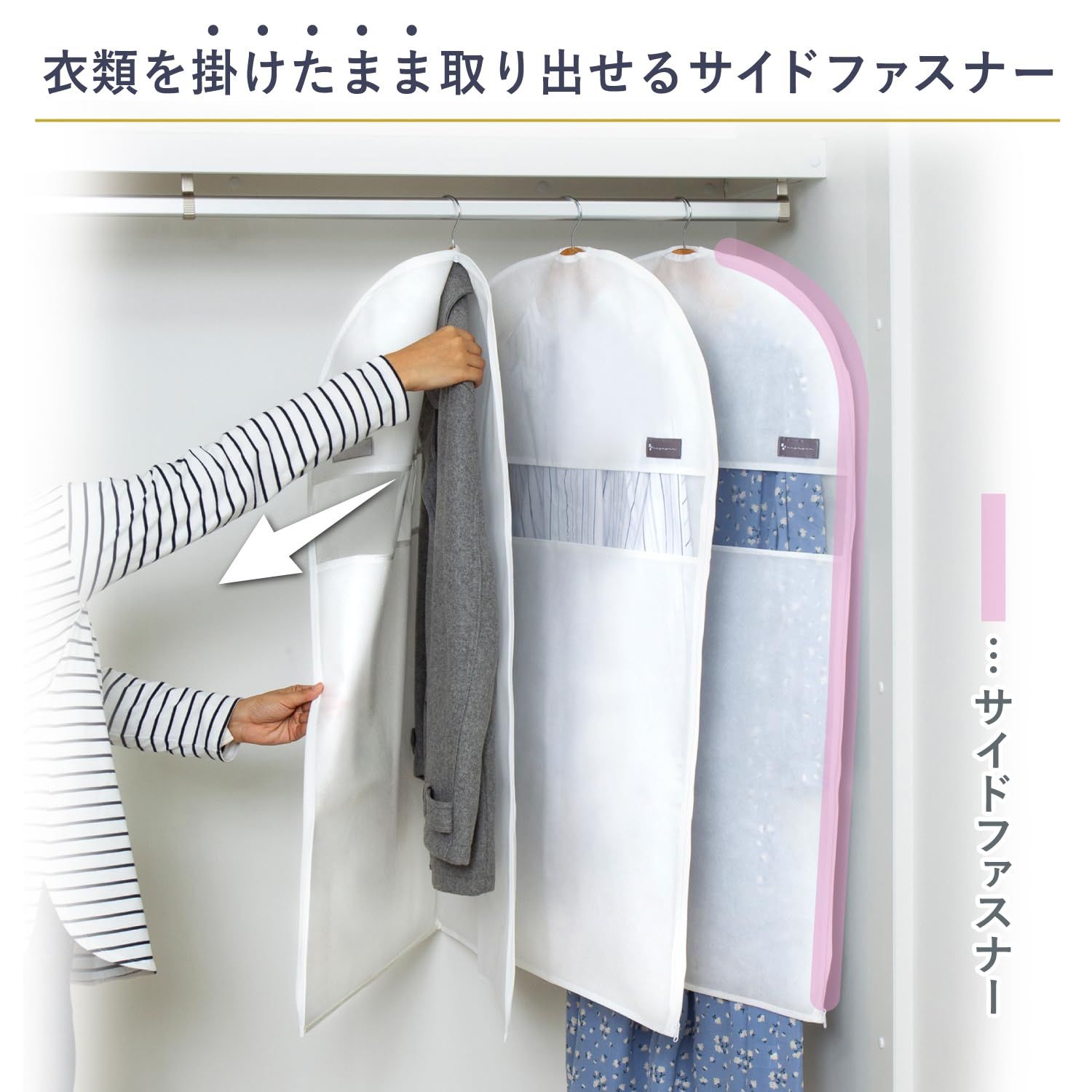 【洋服の上から被せるだけの簡単カバー/下部開きでロング丈にも対応】:ハンガーに掛けた洋服の上から被せるだけの簡単カバー。クローゼットがスッキリ。下部が開いているので、ロングコートやワンピースなどの丈の長い洋服にも対応。