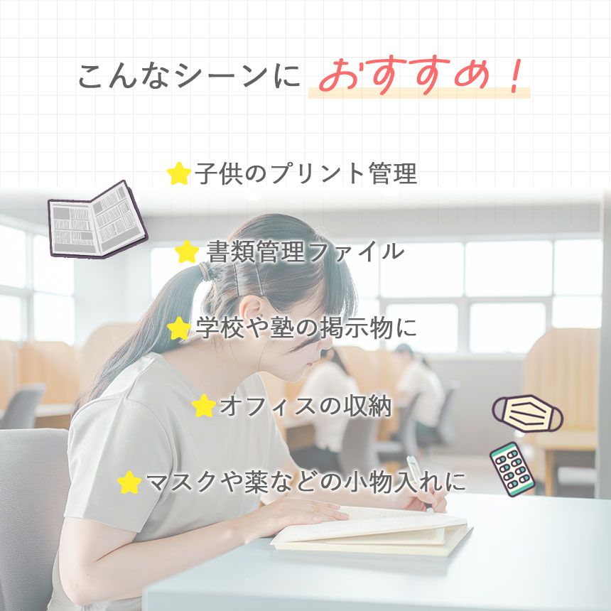 学校のプリント、オフィス書類、郵便物など、ジャンルごとに整理できます。