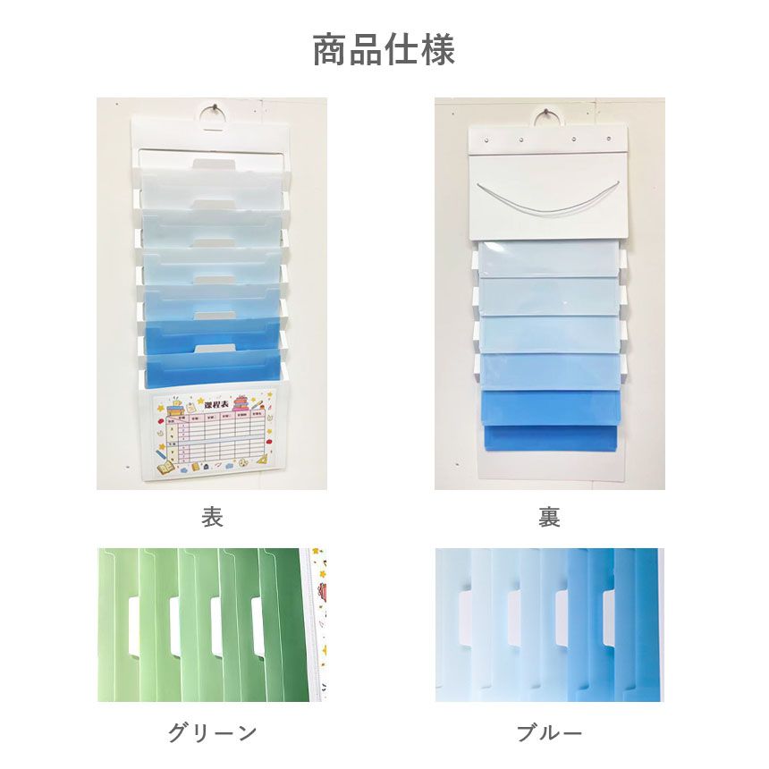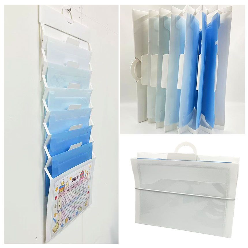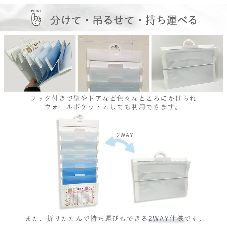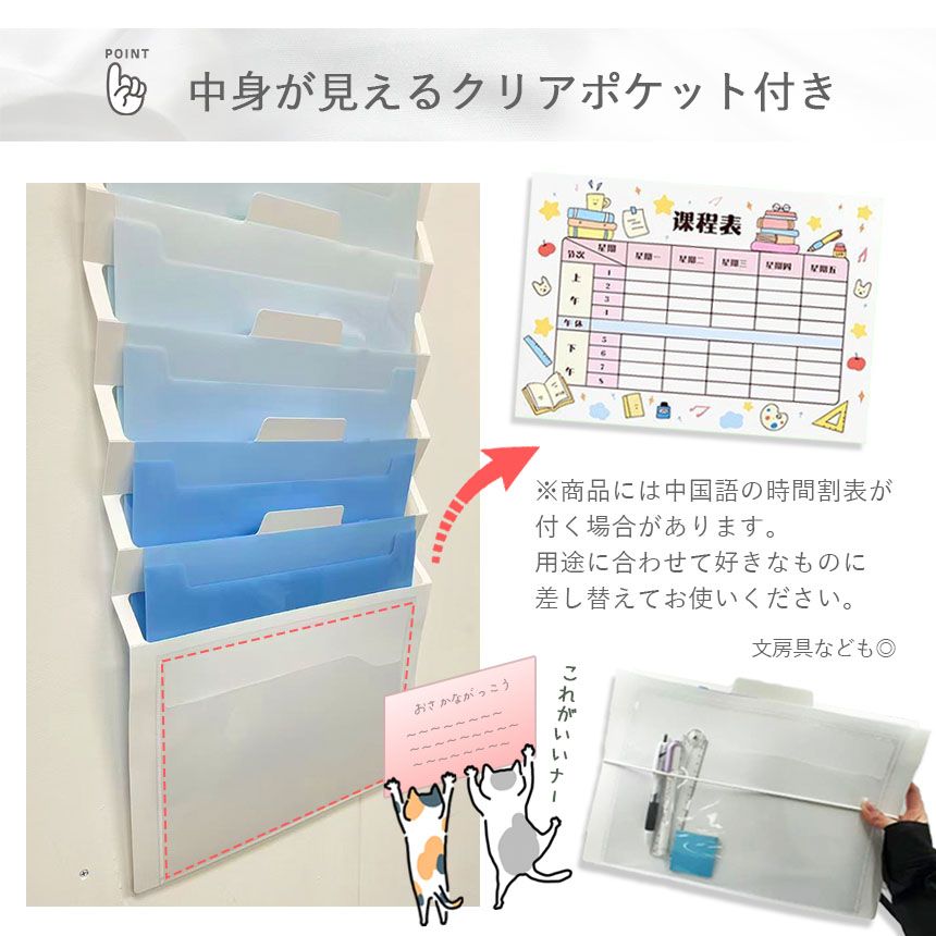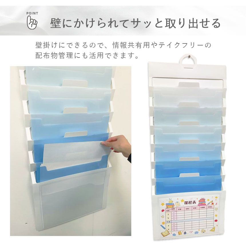学校やオフィスで散らかりがちなプリント・書類・請求書などを、すっきりまとめて管理できるウォールポケットデザインのプリントフォルダー