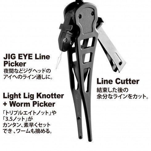 ワーム掴み・ジグアイのライン通し・ラインカッターを装備したマルチピッキングツール。