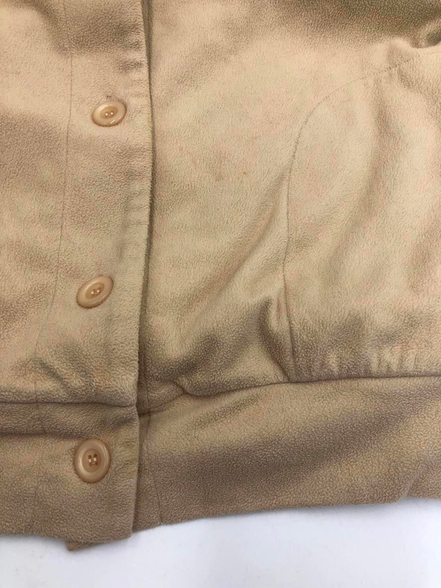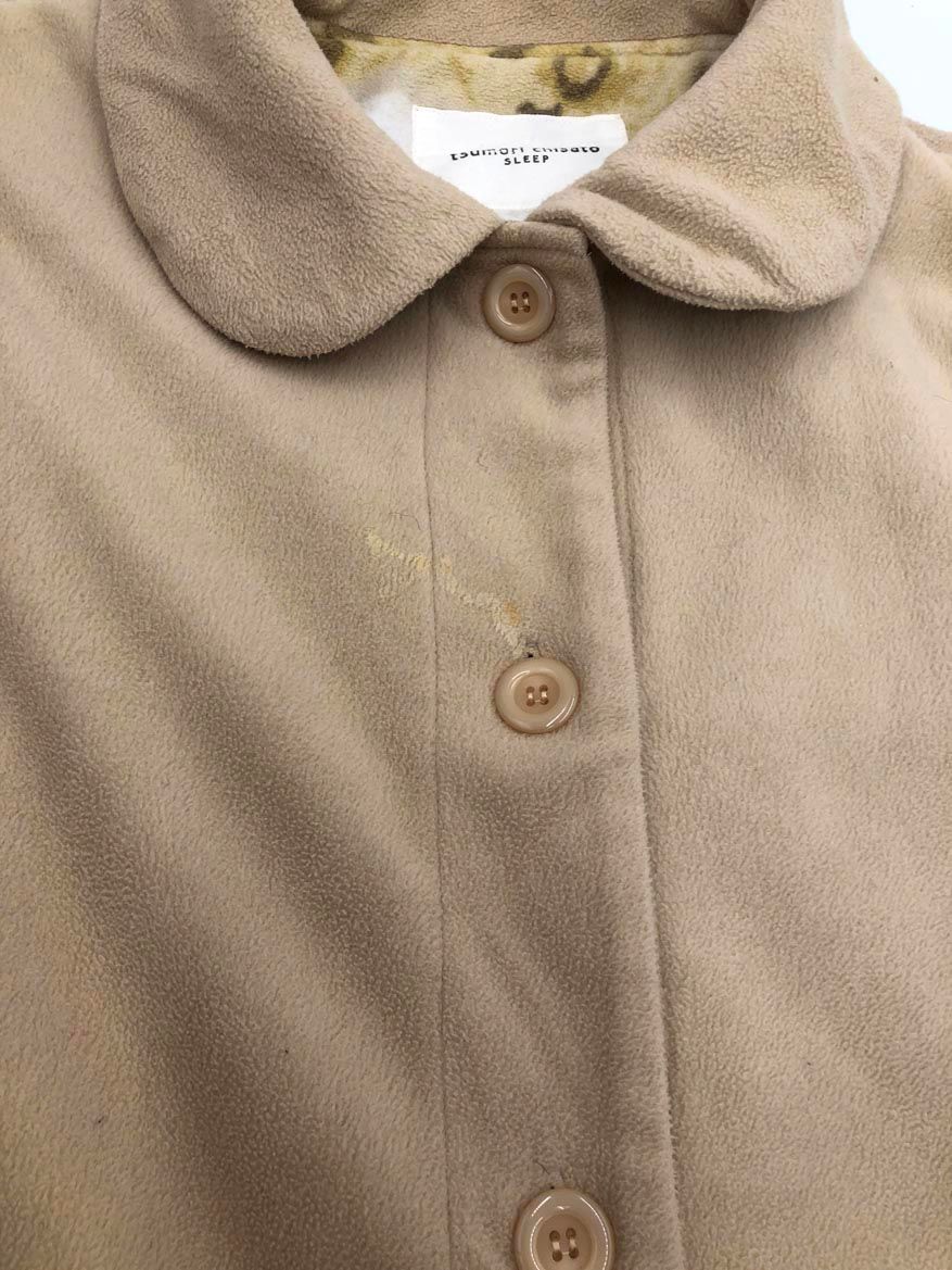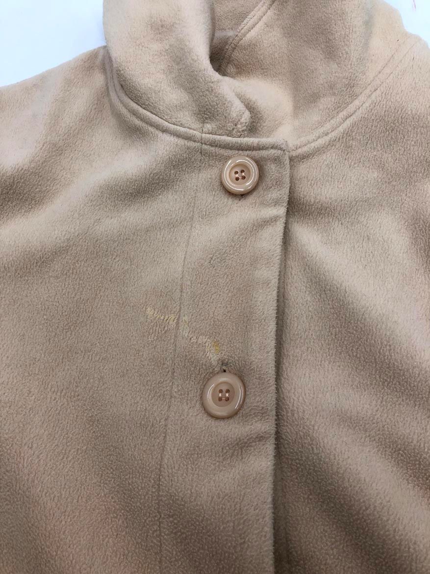 上から二番目のボタン上、後方右下、右袖口に汚れ