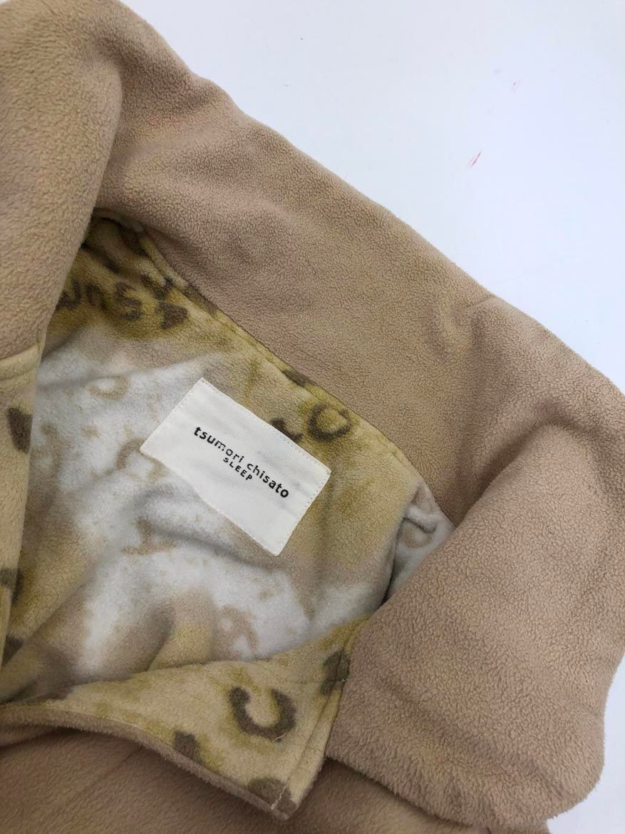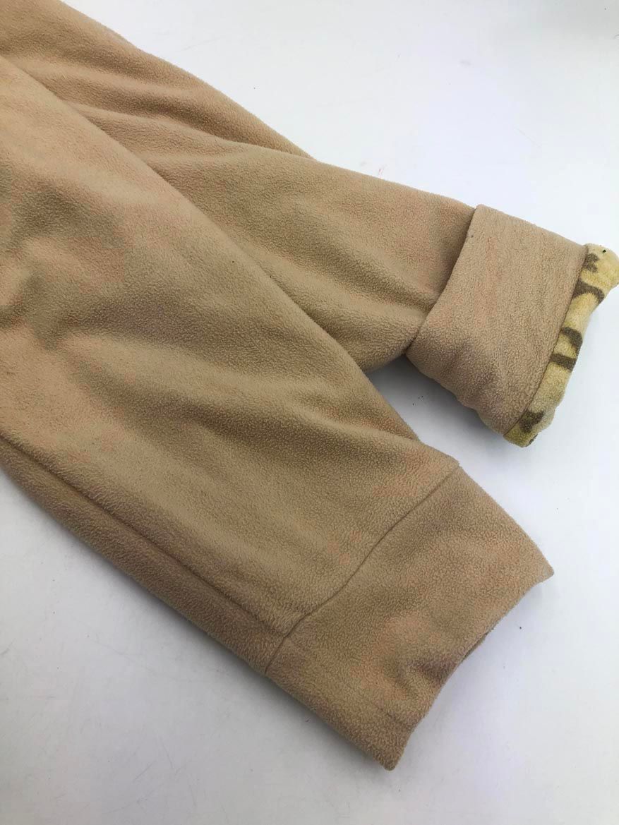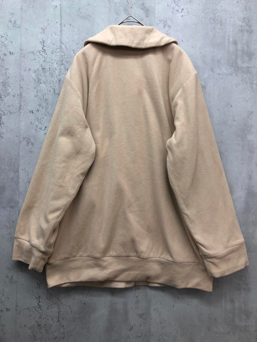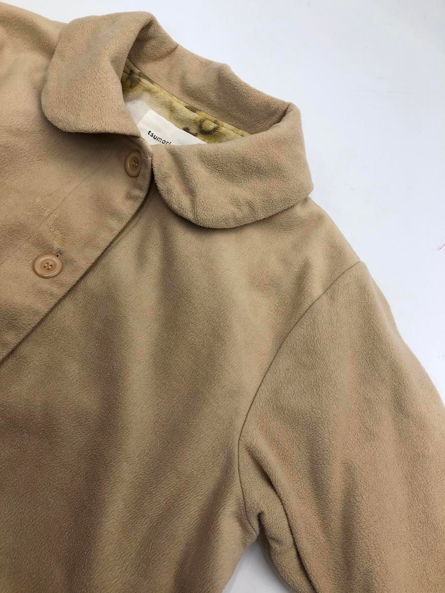 上から二番目のボタン上、後方右下、右袖口に汚れ