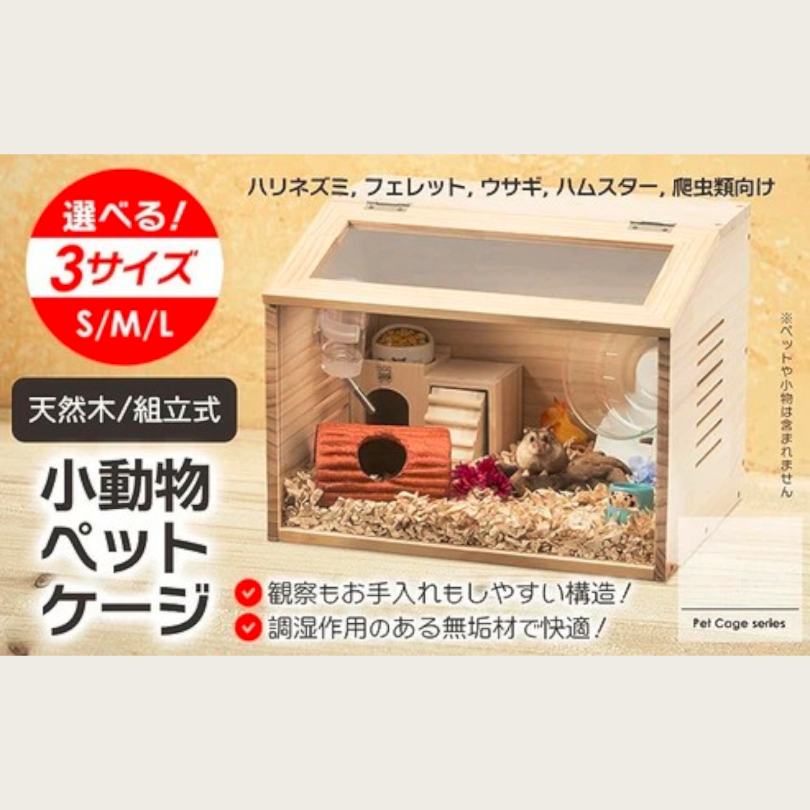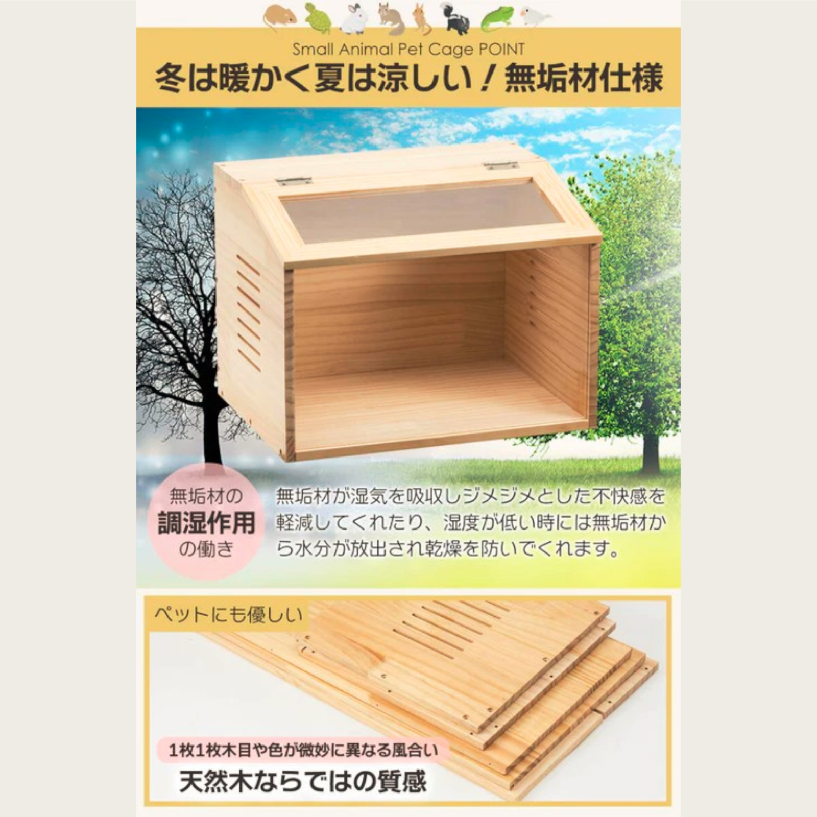 【POINT1:無垢材使用!】夏は涼しく冬は暖かい無垢材を使用しており、ペットを安心・安全・快適に飼育する事が可能です。