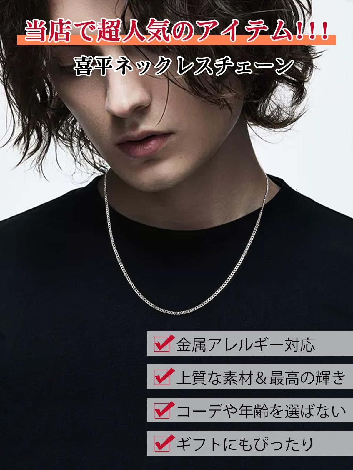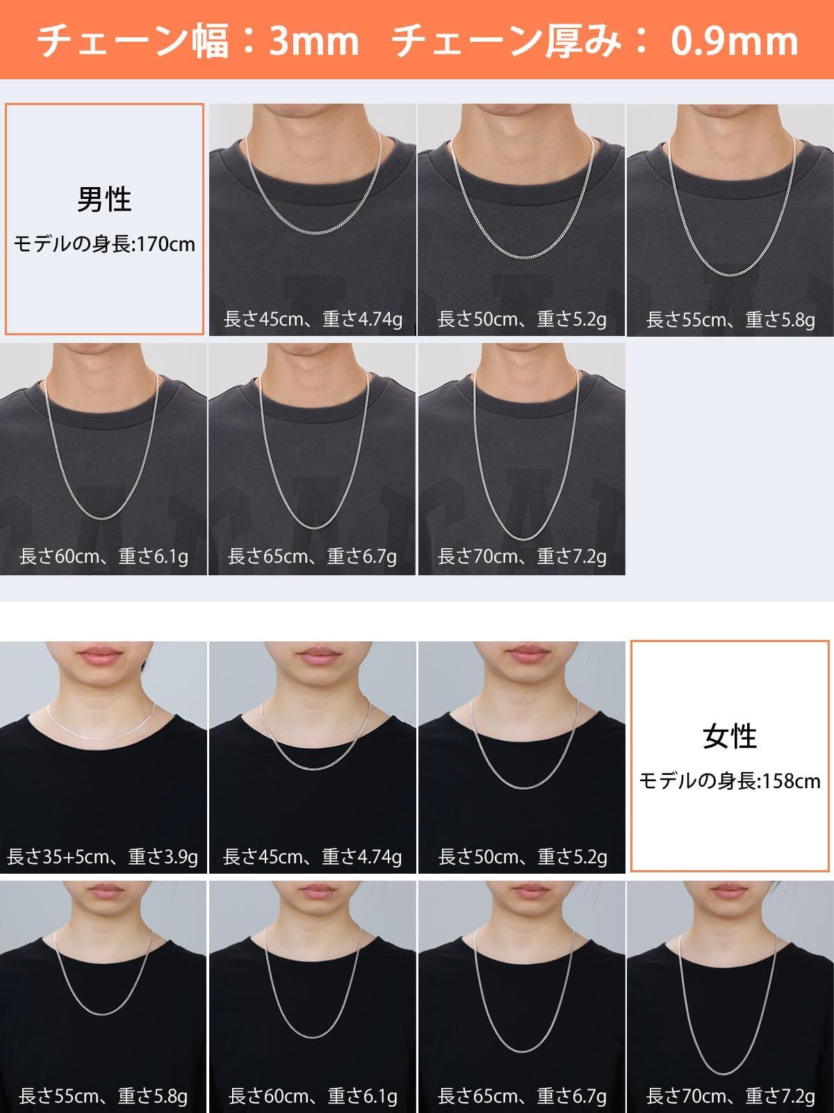 [チェーンネックレス] ネックレスチェーンの幅は約3mmと5mmがあり、チェーンの長さは長さは40cm(35cm+5cm)、45cm、50cm、55cm、60cm、65cm、70cmの7種類をお選びいただけます。