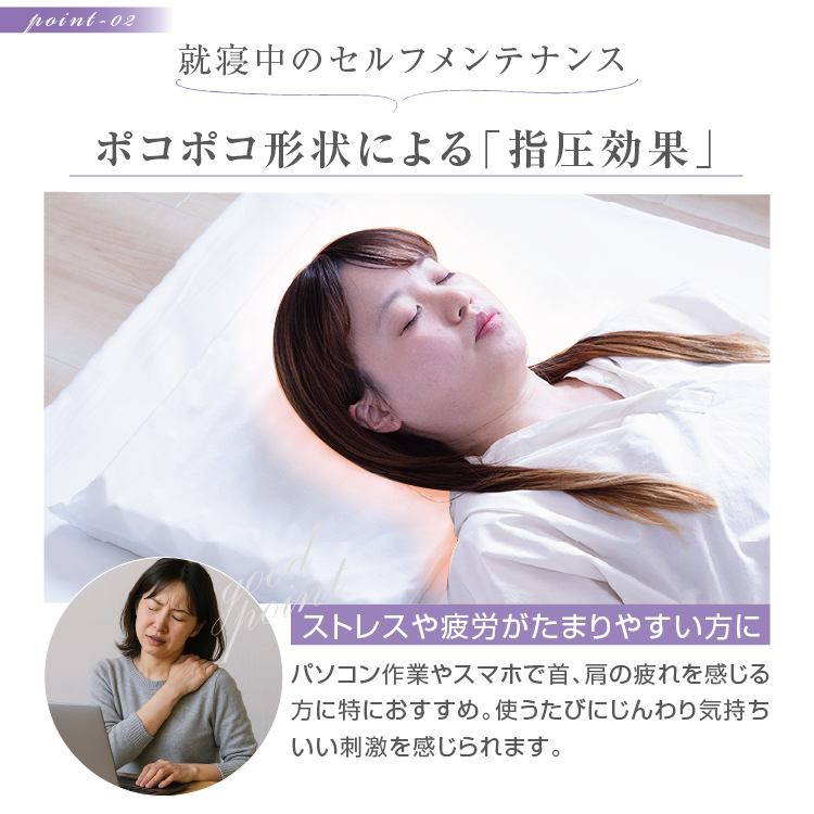 ・波型のポコポコ形状が優しく心地よい指圧効果を生み、就寝中も自然にセルフメンテナンス。首・肩こりが気になる方に特におすすめです。