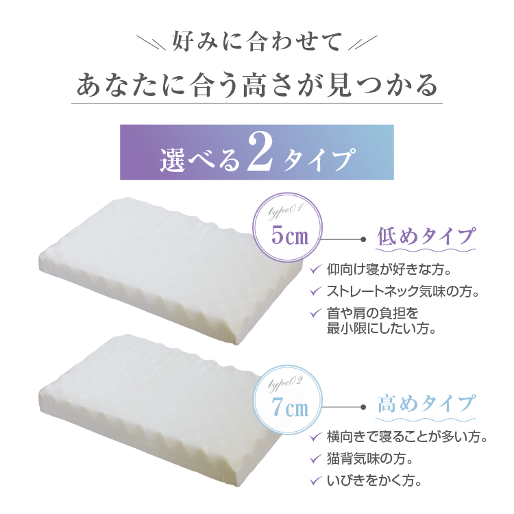 ・好みに合わせて選べる5cmと7cmの2サイズ展開。仰向き寝・横向き寝どちらでも快適な高さをお選びいただけます。