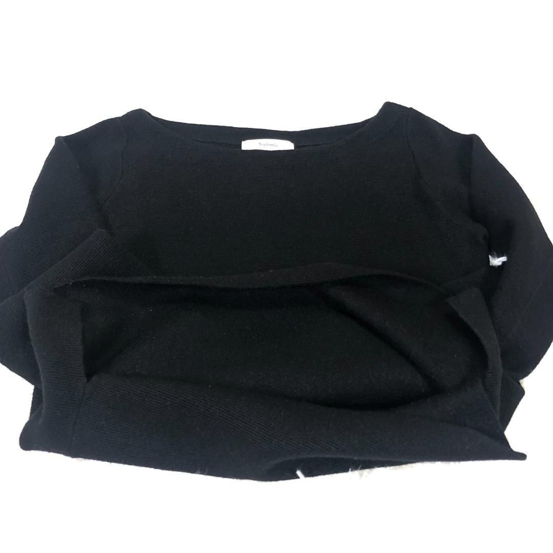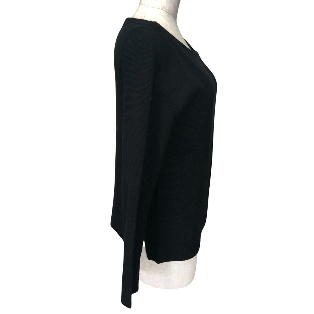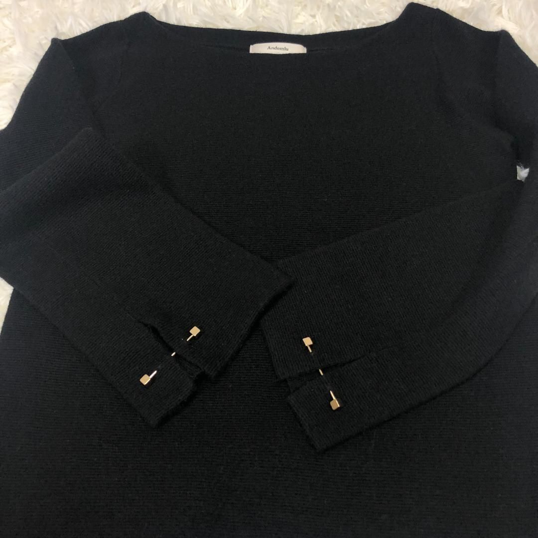 上品なボートネックデザイン・暖かいブラックのニットです。袖口は15cmと広がったデザインで、7cmスリットがあり、銀色・長方形の装飾金具が付いています。両サイド裾には8cmスリットがあります。どんなボトムスにも合わせやすく、着回し力抜群です。