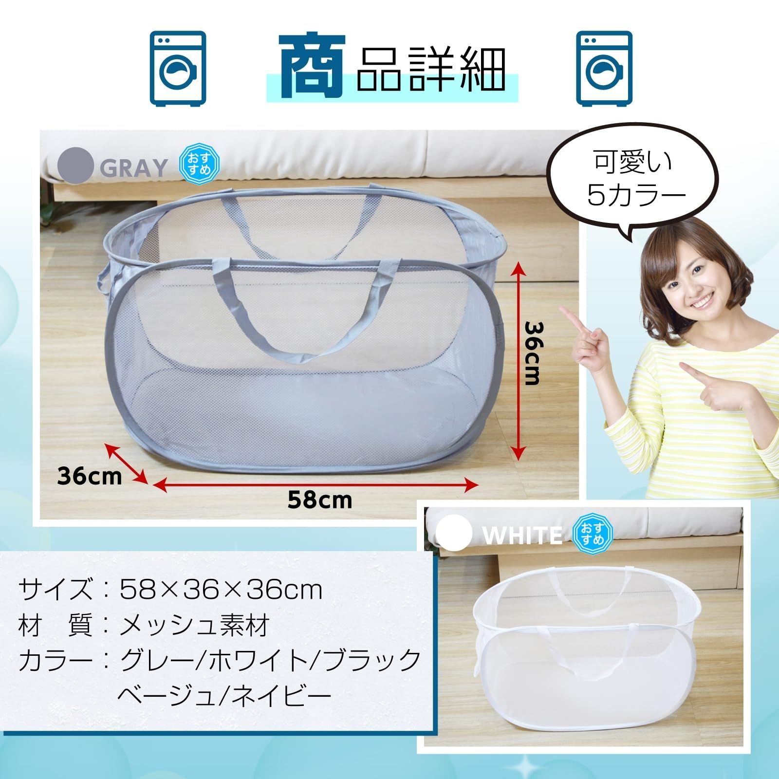 【超軽量 自立する】通気性と防臭性に優れたメッシュ素材のランドリーバスケットは、わずか227gと超軽量です。それでも、衣類を入れなくても自立が可能です。おしゃれな見た目で自宅内の雰囲気を損なわずに使用できます。グレーとホワイトの5色展開です。※折りたたみ部分の金属線は伸縮性が高いので、広げる時は周りにお子さんなどがいないことを必ず確認することをお勧めします。