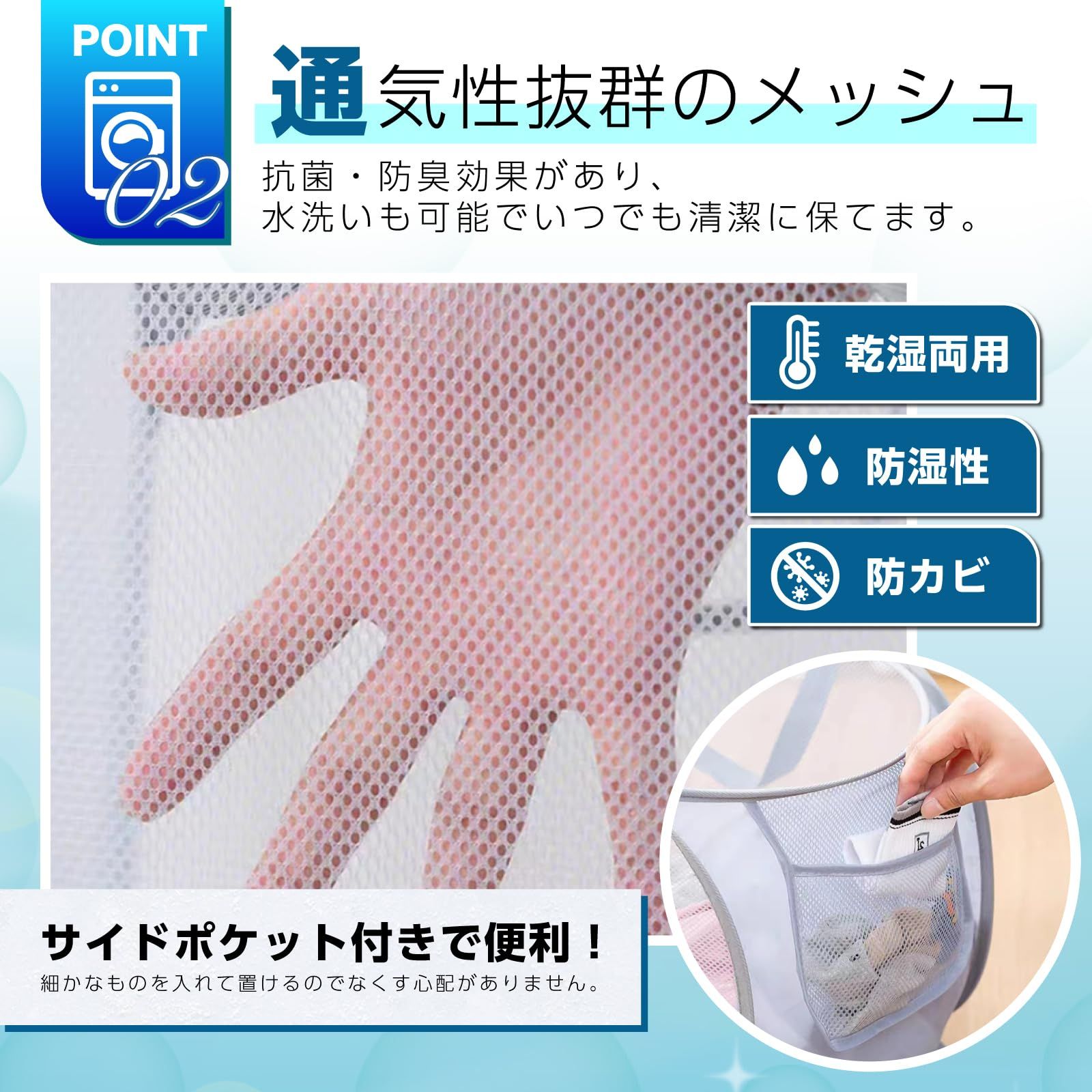 【洗濯物を入れ、濡れた服もOK】一般的なプラスチック製の洗濯カゴとは異なり、メッシュの洗濯カゴは自由に折りたたむことができ、一般的な布製の洗濯かごとは異なり、濡れた衣類を自由に収納することができます。速乾性に優れ、防臭・抗菌・防カビ機能を備えた「洗える ランドリーバスケット」です。※本商品を洗濯機で洗うことはお避け下さい。