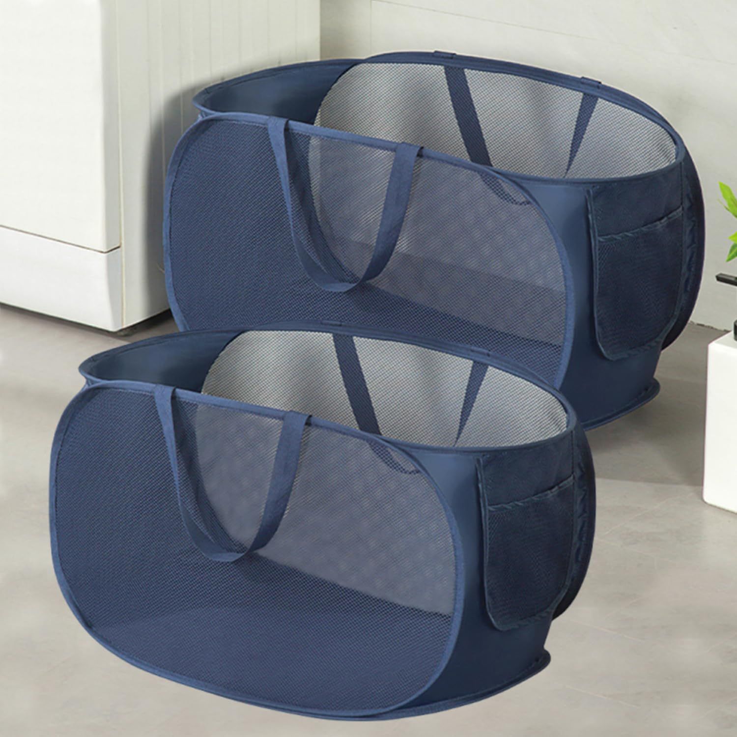 洗濯カゴ オシャレ 折りたたみ ランドリーバスケット おしゃれ メッシュ 自立 ランドリーバッグ ランドリーボックス 折りたためる バスケット コンパクト 軽量 横型 洗濯かご 洗濯籠 洗濯物入れ 脱衣カゴ 持ち手付き 省スペース 旅行 洗濯 ネイビー 2個セット