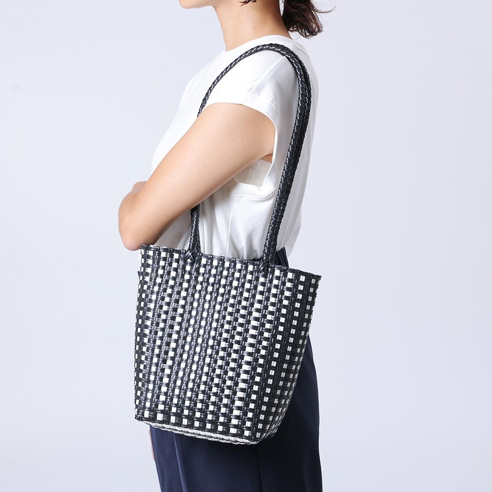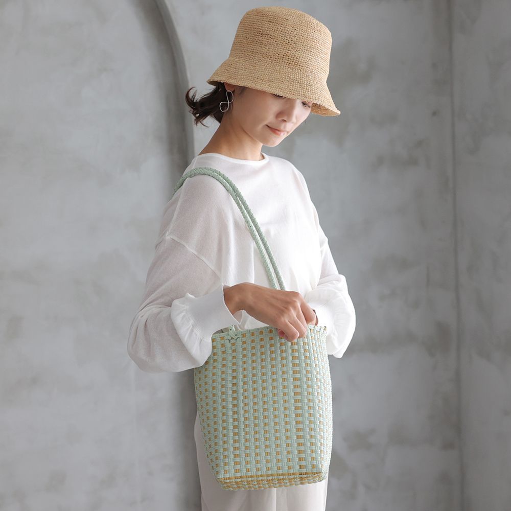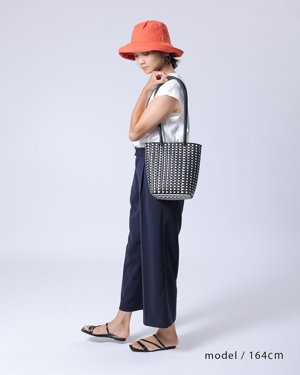 持ち手を長くし、肩にかけて持ちやすく仕上げたメルカドウーヴンバッグ。さらに肩にかけたままバッグの中を見れる絶妙な長さで持ち物を捜す時の置き場所確保やバッグの上げ下げのちょっとしたわずらわしさから解放されます。マイボトルや長財布が入る大きさで水にも強いポリプロピレン素材はレジャーにもおすすめです。