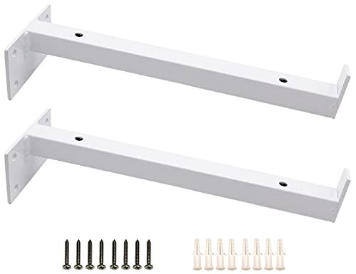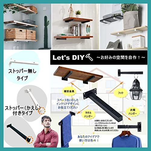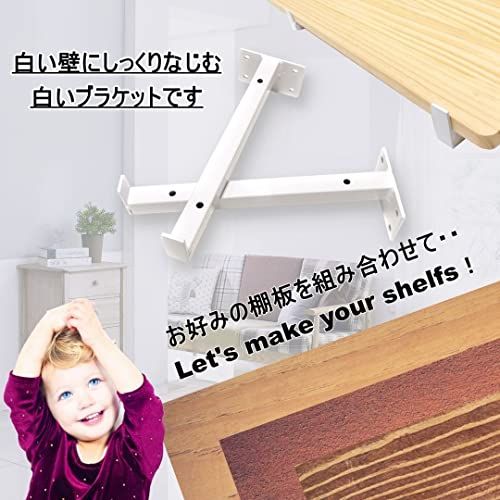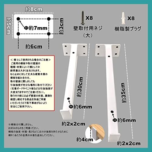 <数量>ブラケット 2本 <サイズ>出幅:約35cm、棒の直径:約2x2cm、壁側ベース:約5x8cm(ビス穴ピッチ:約3x6cm)、かえし部高さ:約2cm、ネジ穴:約6mm <付属品>壁取付用ネジ:8本、樹脂製プラグ:8個 棚板固定ネジ:4本