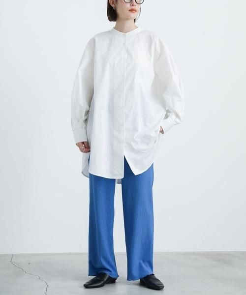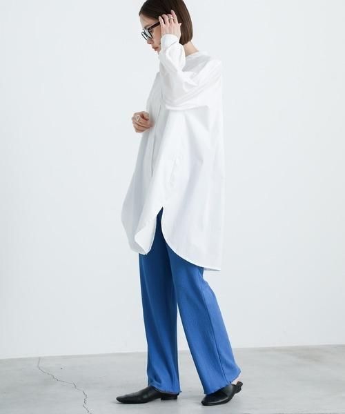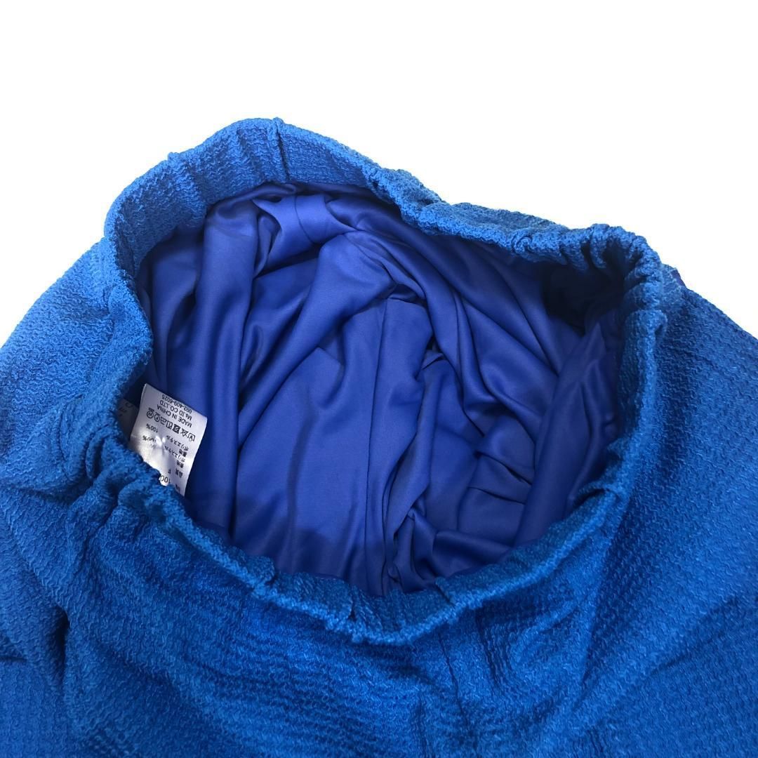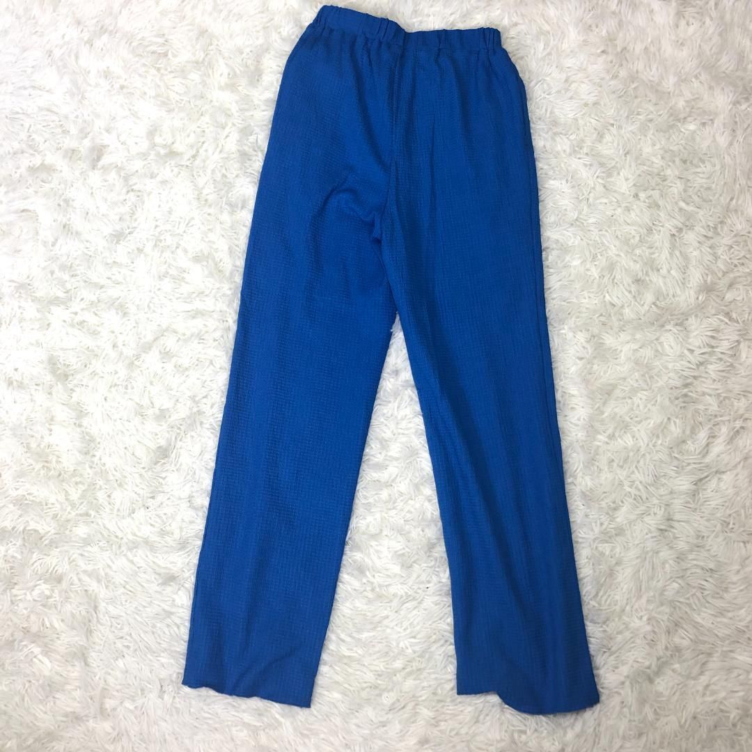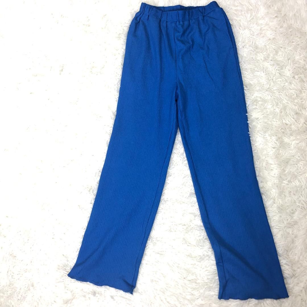 ジャガード生地を使用したウエスト総ゴムの青いパンツです。スラっと美脚に見せてくれるシルエットです。伸縮性の良い素材なので着心地も抜群です!冬にはオーバーサイズのニット、春にはシャツやブラウスと長い期間ご着用頂けます。左右ポケット付き、裏地付きです。