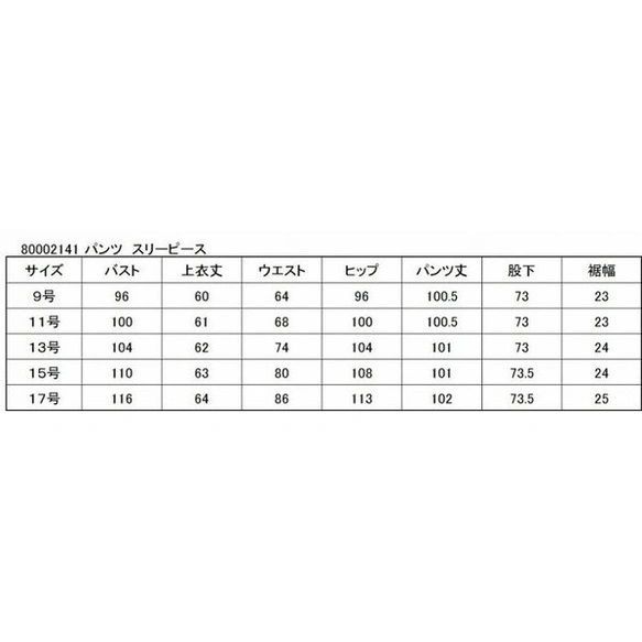 9号 バスト96 上衣丈60 ウエスト64 ヒップ96 パンツ丈100.5 股下73 裾幅23