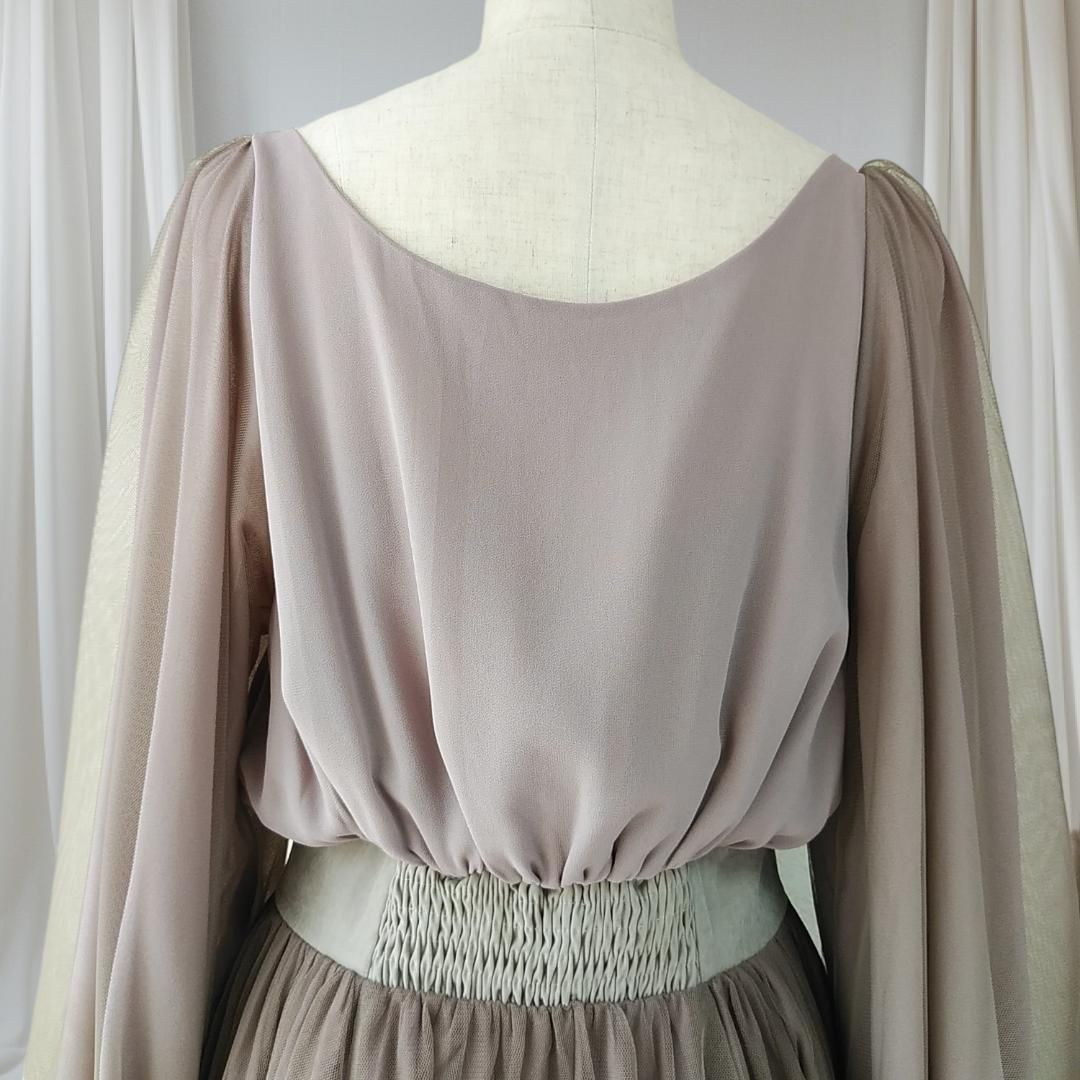 ふわりと広がるボリュームスリーブと、風をはらんで優雅に揺れるチュールスカートが、幻想的な佇まいを演出します。